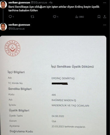 İşçilerin sendikalı olduğu gerekçesiyle işten atılmadığını iddia eden Güncü, paylaştığı üyelik bilgisiyle Erdinç Demirtaş adlı işçinin sendikaya 2020 yılında üyelik başvurusunda bulunduğunu, sendikalı oldukları için işten atılacak olsa daha önce de atılabileceğini ima etti.