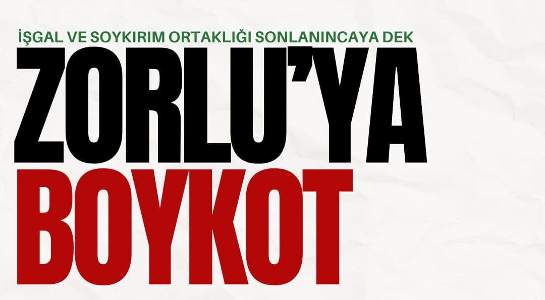 Türkiye’deki tüm Filistin dostu bireyleri ve kurumları, Zorlu Holding işgal devletiyle tüm askeri ve ticari bağını kesinceye kadar, Zorlu Holding’i ve ona bağlı tüm kuruluşları boykot etmeye çağırıyoruz!