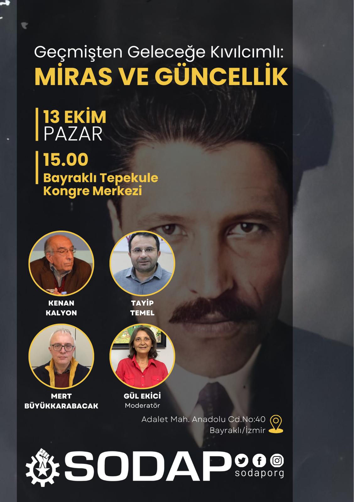 11 Ekim 1971’de hayatını kaybeden Hikmet Kıvılcımlı ve 13 Ekim 2022’de hayatını kaybeden Tevfik Kaçar, İzmir’de Sosyalist Dayanışma Platformu’nun (SODAP) düzenleyeceği panelle anılacak. 13 Ekim Pazar günü İzmir Bayraklı’da Tepekule Kongre Merkezi’nde yapılacak panelde akademisyen Mert Büyükkarabacak, DEM Parti Eş Genel Başkan Yardımcısı Tayip Temel ve Kenan Kalyon konuşmacı olacak.