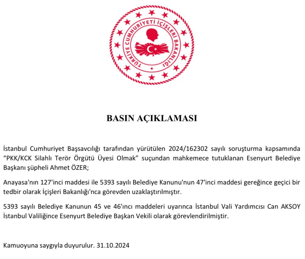İçişleri Bakanlığı, Esenyurt Belediye Başkanı Ahmet Özer’in tutuklanmasının ardından İstanbul Vali Yardımcısı Can Aksoy’un belediyeye kayyum olarak atandığını duyurdu.