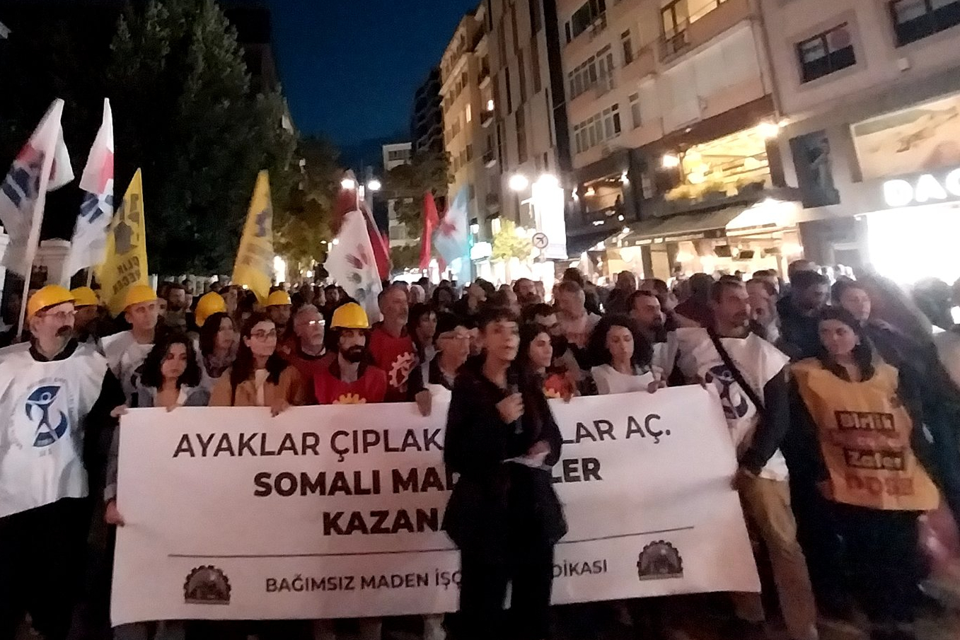 Bizler 3 gündür tek kelime etmeyen, tek lokma yemeyen maden işçilerinin sesiyiz. Memleketin dört yanında meydanlarda madencilerin taleplerini onlar için haykırıyoruz. Hakları için, hayatları için direnen maden işçileri; tüm işçilerin, emekçilerin, toplumun sesi, adalet arayışı, umudu oldu. Maden işçilerinin ölmesine izin vermeyeceğiz. Maden işçilerinin sesi olacağız. Maden işçileri kazanacak!