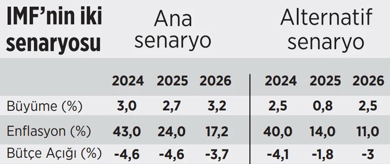 Görüldüğü gibi IMF’nin gönlünde yatan, daha acımasız, sosyal etkileri daha derin, faturayı halk kitlelerinin sırtına yükleyen bir şok terapidir. Olmadı ana senaryoya, daha yumuşak bir geçişe de rıza gösterebileceğini söylüyor. Tabloda görüldüğü gibi ana senaryoda 2025’te enflasyon yüzde 24’e düşerken, alternatif senaryoda yüzde 14’e kadar geriliyor. 2025 büyümesi birincide yüzde 2,5 olurken, diğerinde yüzde 0,8’e kadar düşüyor.
