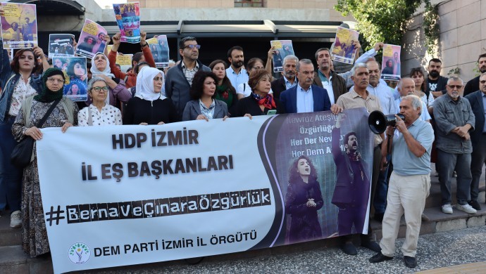 Duruşma sonrasında karar adliye önünde “Berna ve Çınar yalnız değildir”, “Baskılar bizi yıldıramaz” ve “Berna ve Çınar’a özgürlük” sloganlarıyla protesto edildi. Adliye önünde konuşan DEM Parti İzmir İl Eş Başkanı Vezan Karabulut, tutuklulara adeta düşman hukuku uygulandığını vurgulayarak, “İçeride bir komedi oynandı. Tamamen düzmece ve kurmaca bir iddianame hazırlanmış. Eş başkanlarımız tamamen siyasi faaliyet yürüttüğü için yargılandı. Cezaevindeki tüm siyasi tutsaklar özgür olana kader mücadelemizi sürdüreceğimizi yineliyoruz” dedi.