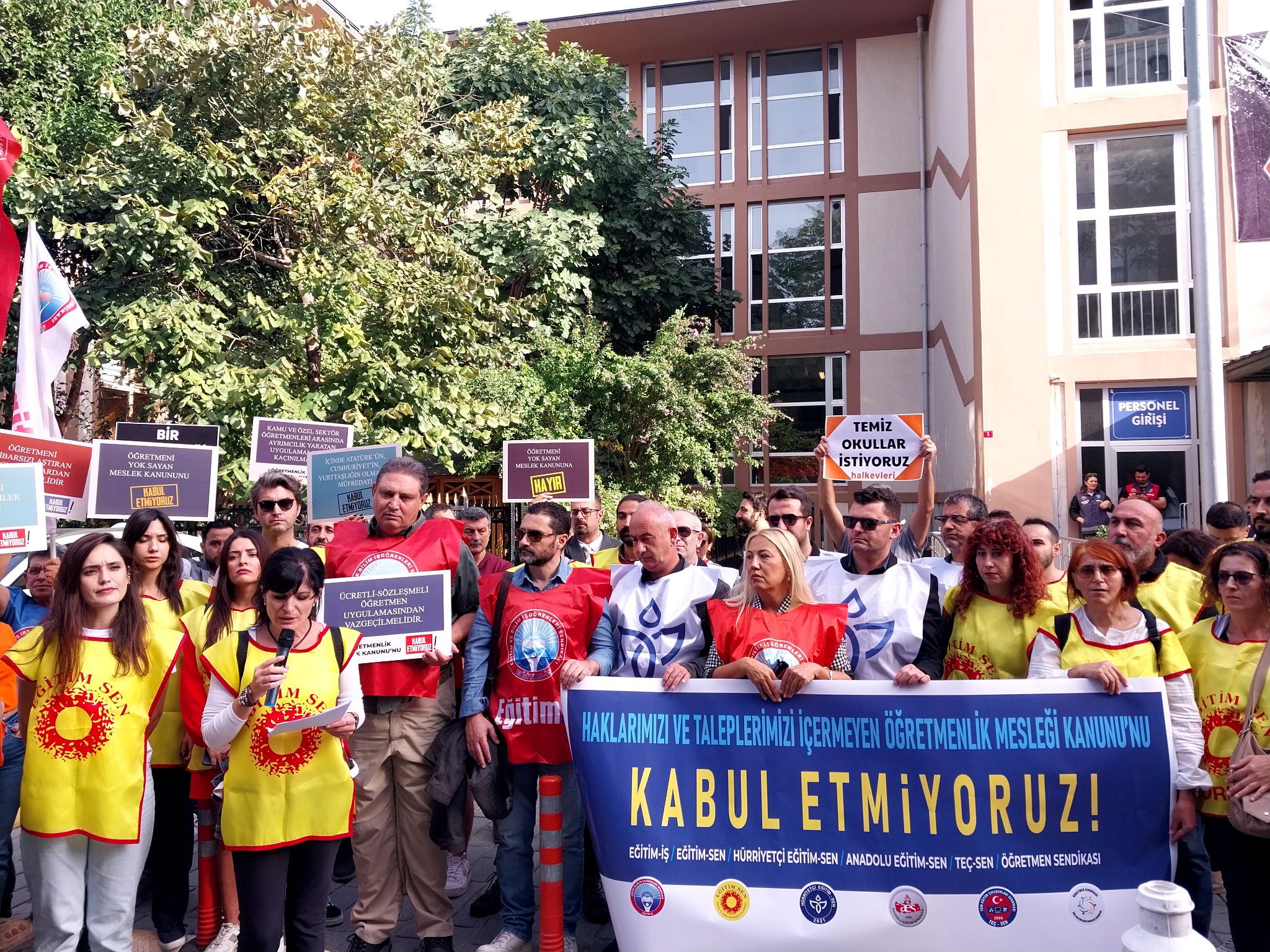 Öğretmenler, Öğretmenlik Meslek Kanunu’na karşı yapılan eylemin ardından yaptıkları açıklamayla imzaları teslim etti. Yapılan açıklamada Milli Eğitim’in 30 bin yeni personel alınacağını duyurmasını da yetersiz bulduklarını dile getiren öğretmenler, “120 bin okul var, Bakanlık 30 bin personel alımını müjde olarak duyuruyor” dedi.