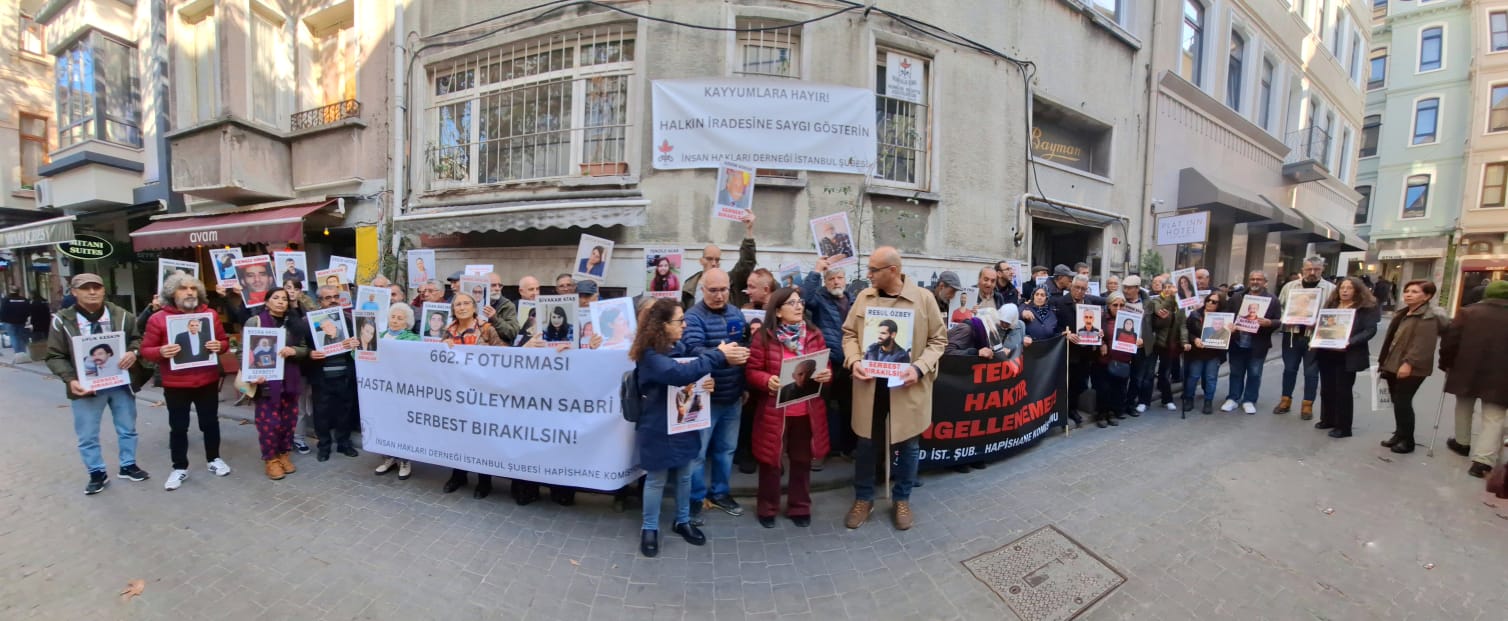 İnsan Hakları Derneği İstanbul Şubesi Hapishane Komisyonu 662. F Oturması’nda halen, Van F Tipi Hapishanesi’nde tutulan, tutuklama amacıyla gözaltına alındığı sırada kalp krizi geçirerek hastaneye kaldırılan, infaz ertelemesi başvurusu sonrası gönderildiği hastanede ayrıca, prostat, hipertansiyon, görme kaybı, kalp hastalığı, kronik akciğer hastalığı ve bağlı nefes darlığı ile yürümede zorlanma sorunları yaşadığı tespit edilen Sabri Mavi için bir araya geldi.
