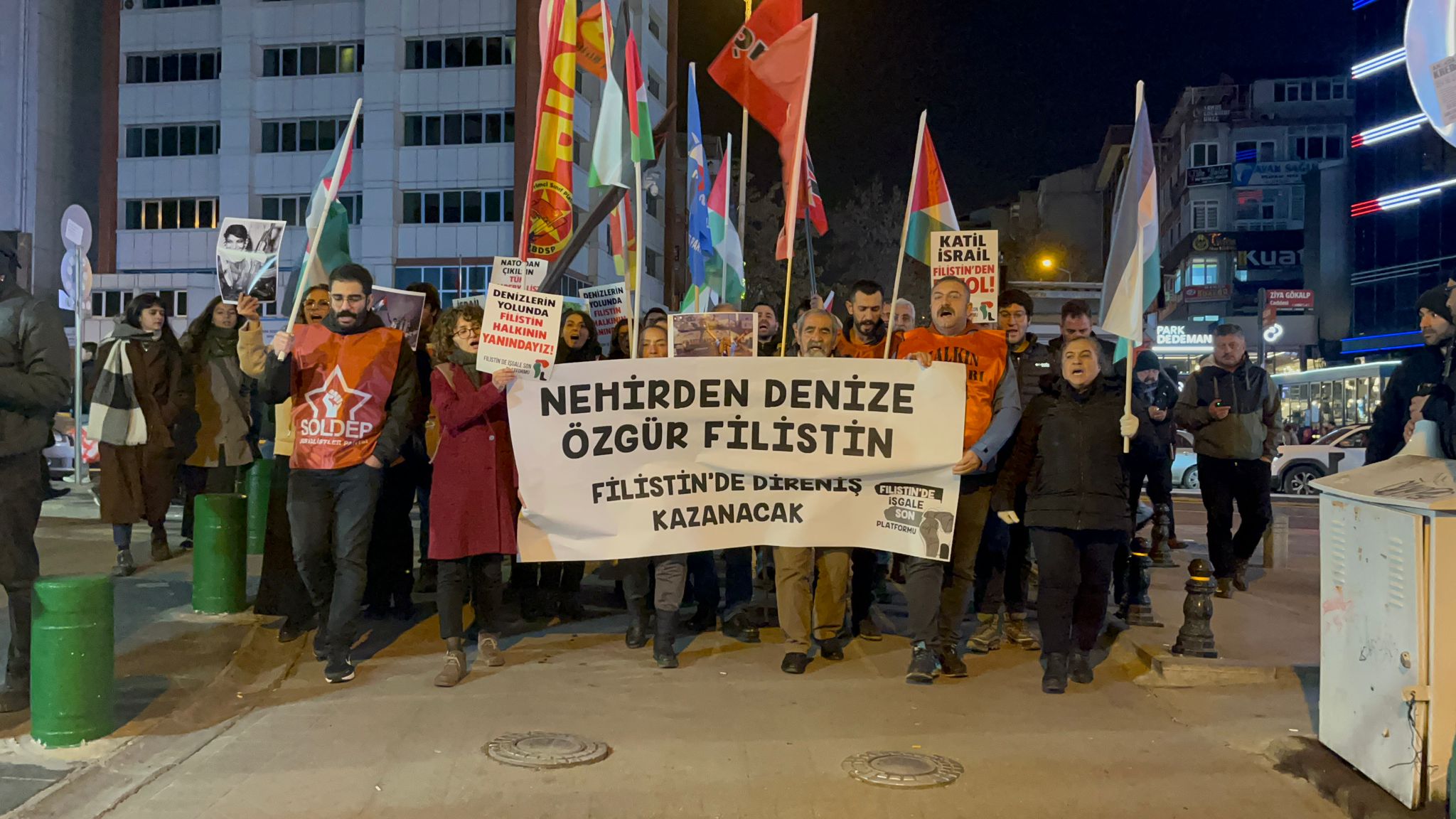 Sakarya Caddesi’ne yürüyen kitle bir basın açıklaması yaptı. Platform, Gazze halkının en büyük katliamlardan birine hedef olduğunu ve olmaya devam ettiğini ve siyonist rejimin okul, pazaryeri, hastane gibi; savunmasız insanların ve çocukların sığındığı yerleri vurduğunu hatırlattı. Direnen halkları hiçbir kuvvetin yenemeyeceğini haykıran platform Filistin’de temiz su, yiyecek ve ilaç olmadığını hatırlattı.