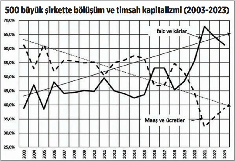 Bu çarpık tabloyu özel sektörde 500 büyük şirketteki bölüşüm ilişkilerinde de görüyoruz. 2003 yılında 500 büyük şirketin net katma değeri içinde ücret ve maaş ödemelerinin payı yüzde 61’den fazlaydı. Faiz ve kâr gelirlerinin payı ise yüzde 39’a yakındı. 20 yıl sonra 2023’te tam tersi bir tablo ortaya çıktı. 500 büyük şirketin katma değeri içinde ücret ve maaşların payı yüzde 38,8’e düşerken faiz ve kârın payı yüzde 61,3’e çıktı.