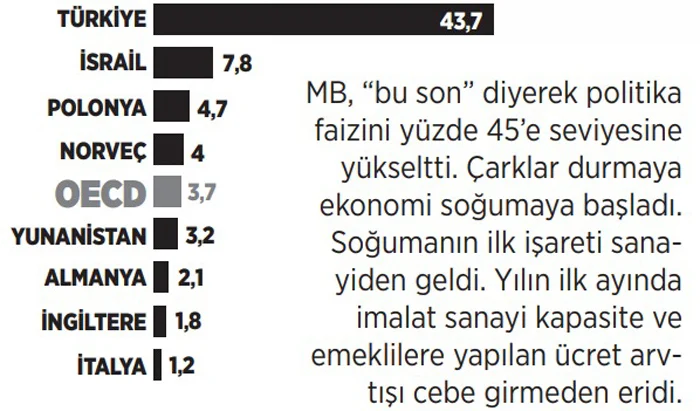 Türkiye’den sonra ikinci sırada yer alan İsrail’de ise gıda enflasyonu sadece 7,8. İki ülke arasındaki fark tam 35,9 puan.