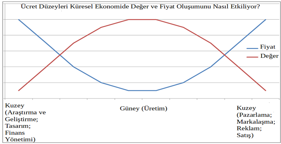 Güney’de ücretlerin düşük olması, sadece normalde elde edilebilecek olandan daha yüksek bir küresel kâr oranı yaratmakla kalmaz; aynı zamanda Güney’de üretilen malların fiyatını da etkiler. Ana akım iktisatta, örneğin bir akıllı telefonun üretim zinciri boyunca piyasa fiyatının oluşumu, katma “değer” açısından bir “gülen eğri” olarak tanımlanabilir. Ana akım teoride katma “değer”, üretim zincirinin her adımında, klasik fiyat terimleriyle, üretimin ilave maliyetine eşdeğerdir. Yüksek ücretli araştırma ve geliştirme, tasarım ve finans yönetiminin Kuzey’de yer aldığı zincirin ilk kısmında katma “değer” yüksektir; oysa Güney’de düşük ücretli emeğin ürünü fiziksel olarak ürettiği orta kısımda eğri düşer. Katma değer, eğrinin sonuna doğru, perakende çalışanlarının ücretleri bu ülkelerdeki en düşük ücretler arasında olmasına rağmen, markalaşma, pazarlama ve satışın Kuzey’de gerçekleşmesiyle tekrar yükselir. “Gülen eğri” mantığında, ürünün değerinin ana kısmı Kuzey’de eklenirken, ürünleri üreten Güney’deki emek, bunun yalnızca çok az bir kısmına katkıda bulunur. Marksist terimlerle ifade edecek olursak, değer, bir metanın üretiminde harcanan toplumsal olarak gerekli emek zamanının toplamıdır. Dolayısıyla, bir akıllı telefonun üretim zincirinde Marksist katma değer kavramı için bir eğri çizilecek olsaydı, bu eğri aşağı yukarı “gülen eğri”nin tersine, bir tür “ekşi surat” biçimini alırdı.[19]
