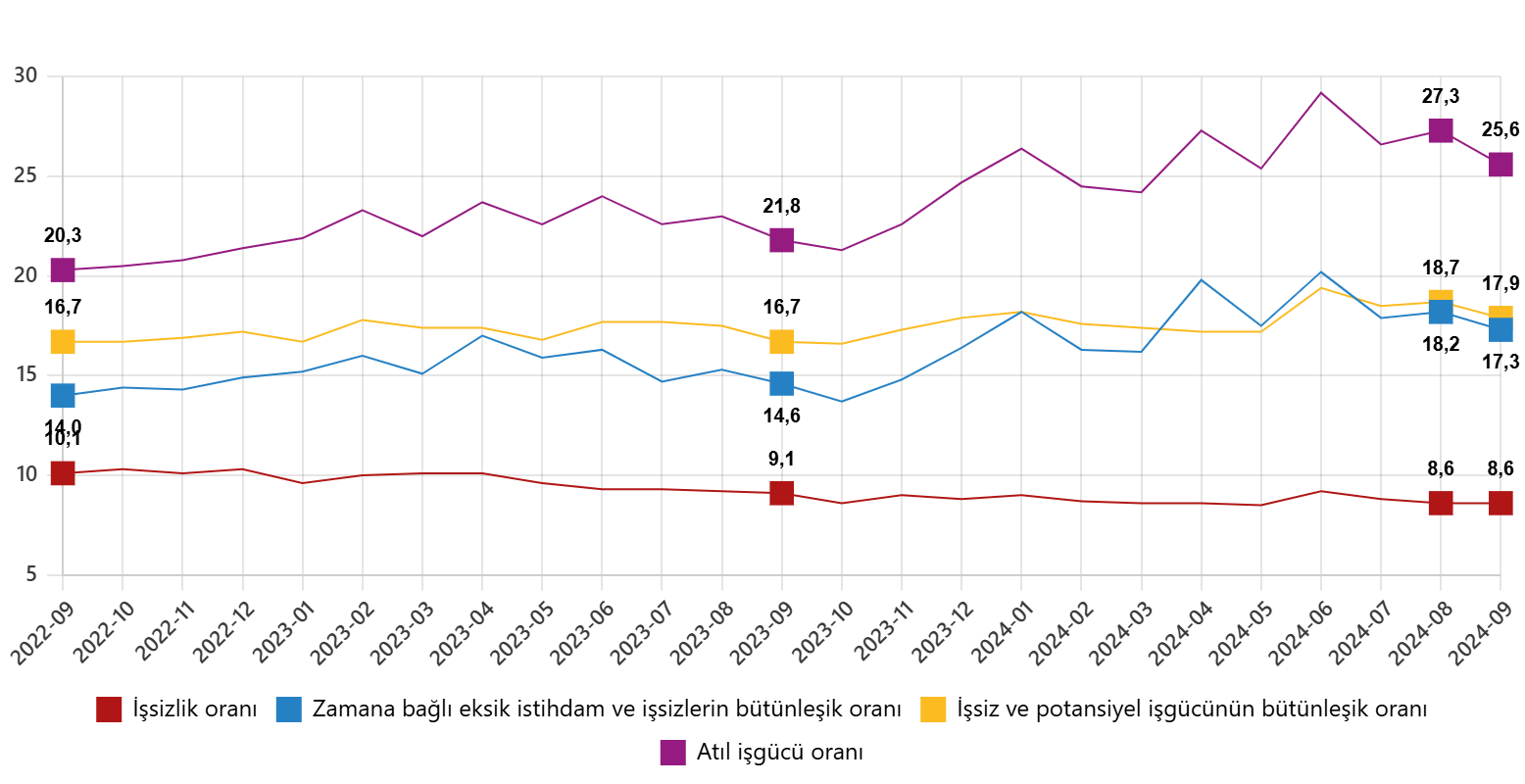 TÜİK verilerine göre eylül ayında atıl işgücü olarak da anılan geniş tanımlı işsizlik ise yüzde 25,6 olarak gerçekleşti