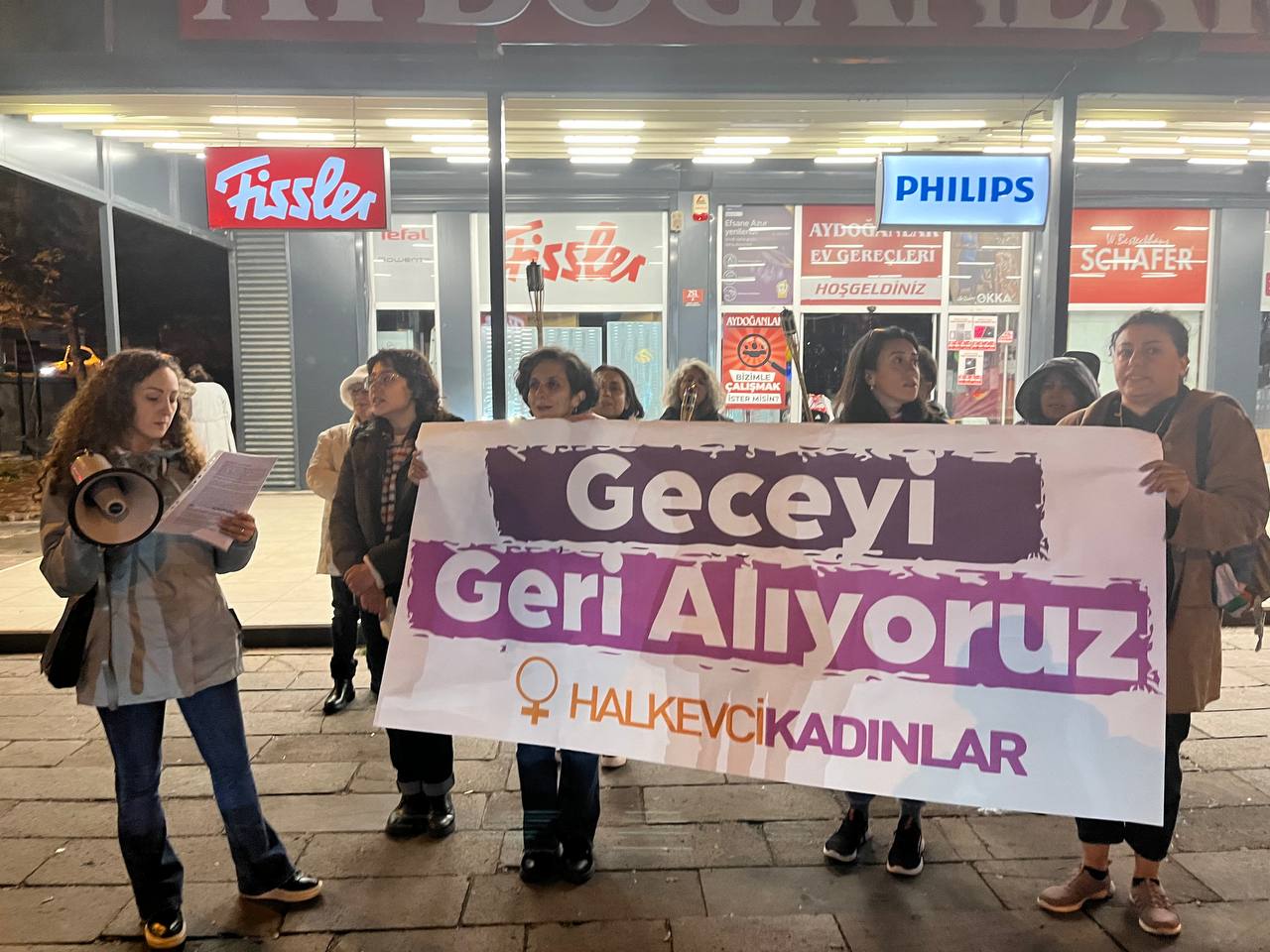 Kadınların yılmadığını, yılmayacağını haykıran Halkevci Kadınlar; birbirlerini yalnız ve çaresiz bırakmayarak kadınların isyanını örgütleyeceklerini, geceleri ve sokakları bırakmayacaklarını söyledi.