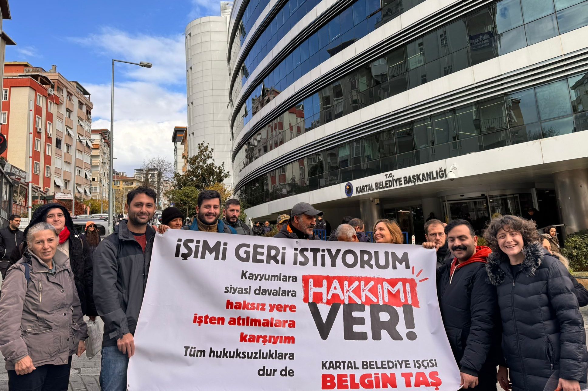 CHP’li Kartal Belediyesi Meclis Üyesi olan Özkan Özdemir ile yaşadığı tartışma sonrasında tazminatsız olarak işten çıkarılan Belgin Taş isimli işçi, yeniden belediye önünde eylemde. Taş’ın eylemine Hakkımı Ver kampanyası gönüllüleri de destek verdi.