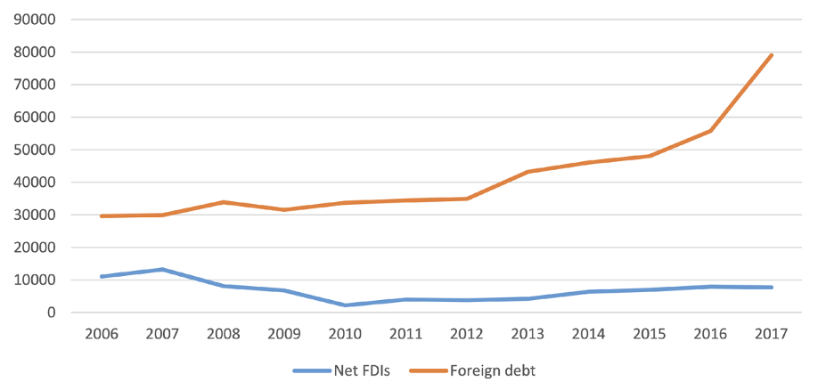 Grafik: Mısır Net Doğrudan Yabancı Yatırımlar ve Dış Borç (2006-2017)