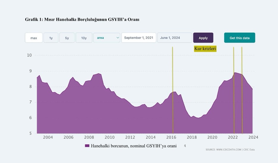Aşağıdaki grafikte, sarı dikey çizgiler Mısır’da son dönemde yaşanan döviz krizlerini belirtmektedir. Hanehalklarının borçluluk oranlarındaki düşüşlerin döviz şoklarıyla örtüştüğü açıkça gözlemlenmektedir. Arap Baharı sonrasında dalgalı da olsa yükselme eğilimi gösteren hanehalkı borçluluğu, 2016 yılında zirveye ulaşmıştır. Ancak o yıl meydana gelen döviz krizi ve sonrasında uygulanan sert mali politikaların etkisiyle, borçluluk oranında keskin bir azalma eğilimi gözlemlenmiştir. Bu politikalar, döviz krizine tepki olarak faiz oranlarının artırılması ve kamu harcamalarının kısılması yoluyla kredilere erişimi ciddi şekilde daraltmıştır. Pandemi döneminde kredi kanalları bir süreliğine yeniden hanehalklarına açılmış olsa da, 2022 ve 2023 yıllarında yaşanan yeni döviz krizleri bu genişlemenin kalıcı olmadığını göstermiş ve hanehalkı borçluluğu tekrar düşüş eğilimine girmiştir. Bu durum, azalan kredi ortamında mevcut kredi imkânlarının hanehalklarına yönlendirilmediğini net bir şekilde ortaya koymaktadır. Ancak burada daha acı bir gerçek karşımıza çıkmaktadır: Hanehalkı borçluluğunun sınırlı ve düşük olması, bir refah göstergesi değil; devletin azalan kredi kaynaklarını, ekonomik krizle başa çıkmak zorunda kalan geniş kesimlerin erişimine açacak bir politika geliştirmediğine işaret etmektedir. Başka bir deyişle, finansallaşmış piyasa ilişkilerinde, kredi ve borcun varlığı da yokluğu da bir sorun teşkil etmektedir. Bu kriz dönemlerinde finansal kaynaklar büyük ölçüde büyük sermaye gruplarına ve stratejik sektörlere yönlendirilirken, hanehalklarının finansal zorlukları daha da artmıştır. Bu noktada, Mübarek doneminde iktidar bloğunun etkin bir unsuru olan ordunun, 2013’teki darbe sonrasında iktidar bloğunun baskın unsuruna doönüştüğü ve literatüre çoğunluğu emekli askerler ve Sisi’ye yakın isimlerden oluşan ‘askerî girişimciler’ olarak giren finansal seçkinlerin bu kaynak dağıtım mekanizmalarında etkin bir rol oynadığı sık sık dile getirilmiştir. Özellikle doğal gaz ticaretinin serbestleştirilmesi, Süveyş Kanalı ve yeni idari başkent gibi mega projelerde büyük rol oynayan bu ekibe geleneksel özel sermaye grupları da eklemlenmektedir.[13] İktidar bloğundaki bu dönüşüm geniş halk katmanlarına karşı yeniden dağıtım süreçlerinde dışlayıcı ve siyasete katılım konusunda iktidar bloğunu emekçi sınıflardan yalıtıcı bir biçim kazanmaktadır. Bunun karşısında pek çok gözlemci halkta iktidara karşı ciddi bir öfke ve politika yapma süreçlerine kayıtsızlığın belirginlik kazandığını ortaya koymaktadır.