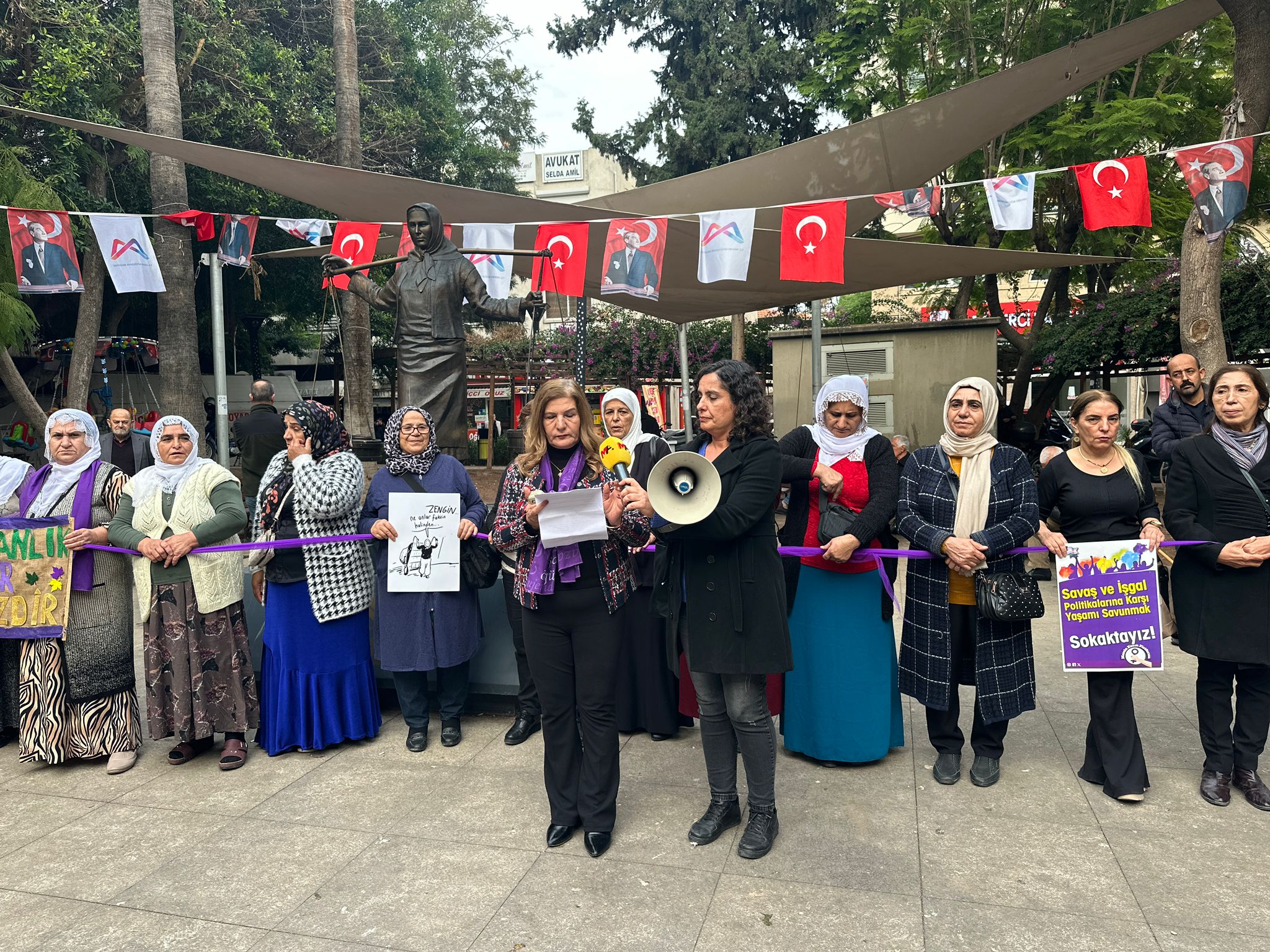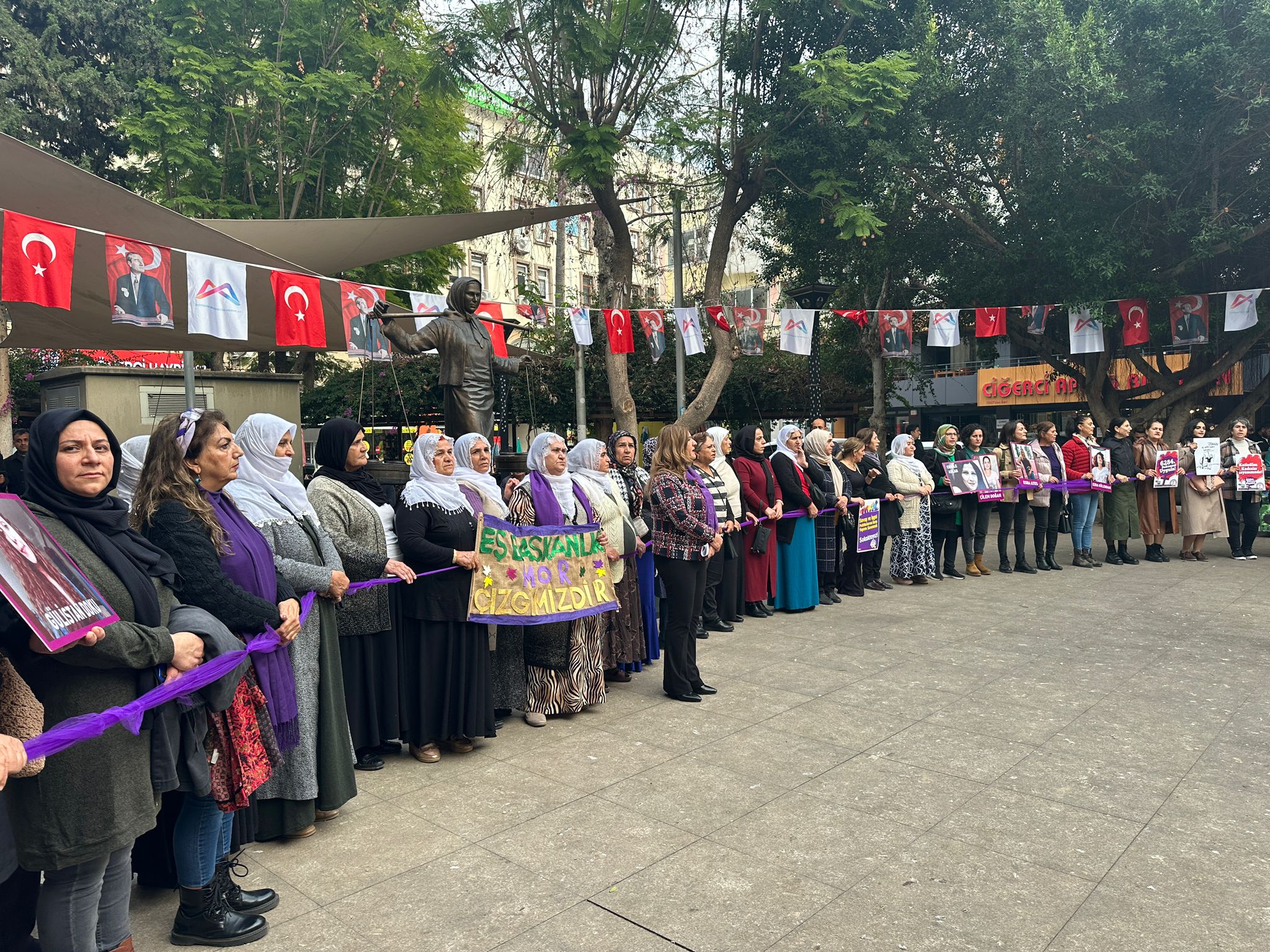 Mersin Kadın Platformu’nun çağrısıyla bugün (21 Kasım) saat 16.00’da Yoğurt Pazarı’nda bir araya gelenler kadın katliamlarına ve erkek devlet şiddetine karşı yaşam zinciri kurdu. Yaşam zincirinde kadınlar sık sık “Jin, jiyan, azadi” sloganını attı. Kadın cinayetlerine, erkek şiddetine, çocuk cinayetlerine, aile politikalarına ses çıkaran kadınlar “Yaşasın kadın dayanışması” sloganını attı.