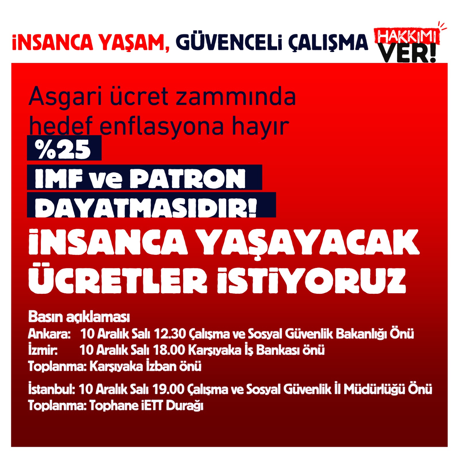 Hakkımı Ver kampanyası gönüllüleri görüşmelerin başladığı gün üç ilde sokağa çıkıyor. İstanbul’da Çalışma ve Sosyal Güvenlik İl Müdürlüğü önü, Ankara’da Çalışma ve Sosyal Güvenlik Bakanlığı önü, İzmir’de ise Karşıyaka İş Bankası önü eylemlerin adresleri olacak. Kampanya gönüllüleri görüşmelerde hedef enflasyonun baz alınmasının IMF programının ve sermaye örgütlerinin dayatması olduğunu ve bunun kabul edilemeyeceğini ifade ediyor.
