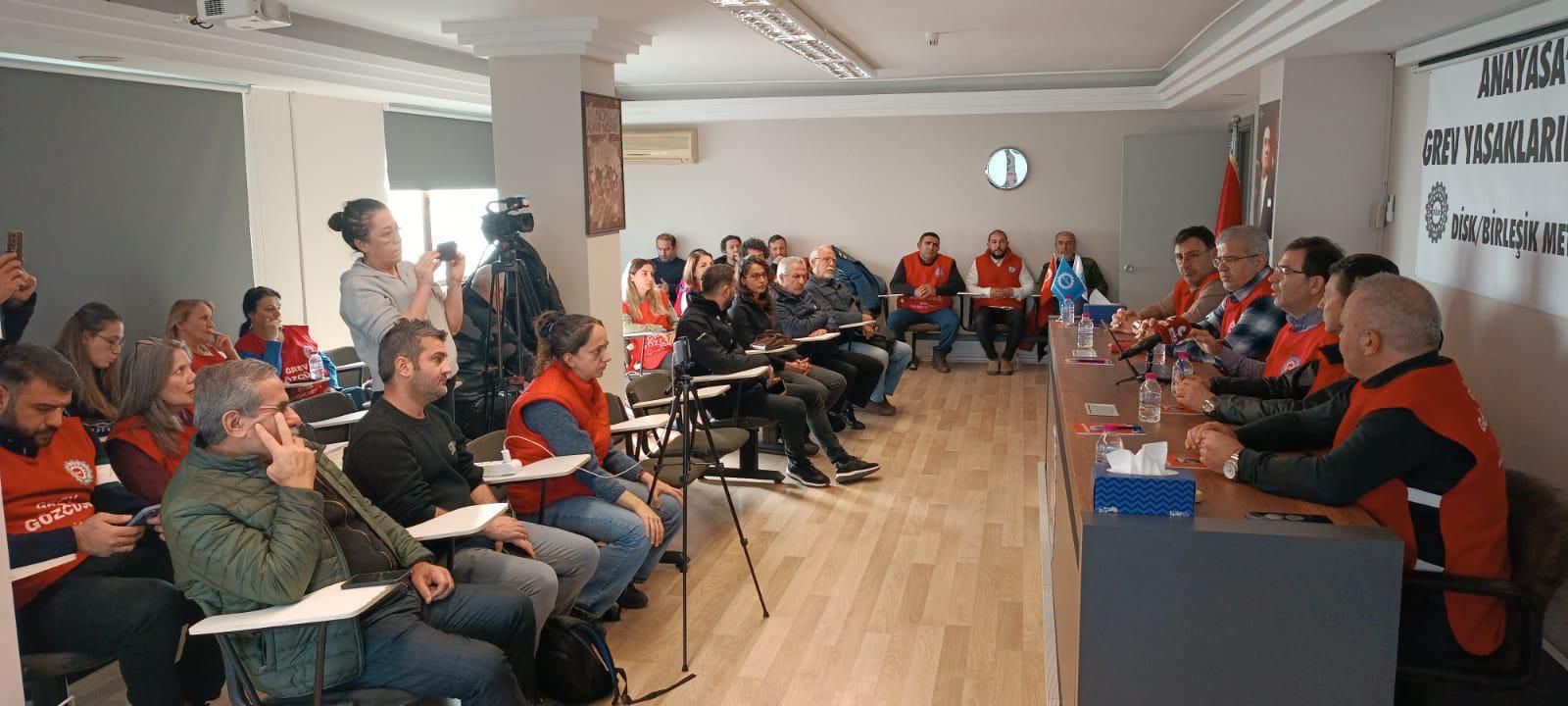 Birleşik Metal-İş Genel Merkezi’nde sendikanın yönetim kurulu üyeleri, MESS üyesi işletmelerdeki grevlerinin Erdoğan kararıyla yasaklanmasına karşı bir basın toplantısı yaparak “Anayasa’ya aykırı grev yasaklarını tanımıyoruz” dedi