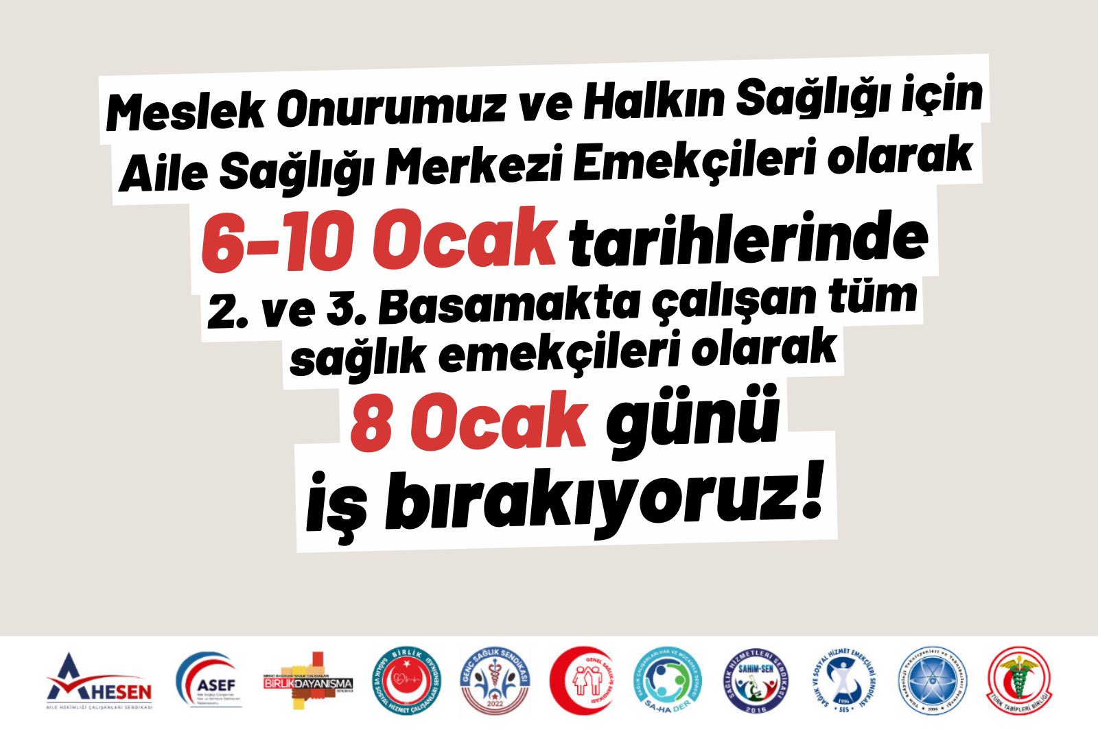 Bu kapsamda 10 Aralık akşamı bir araya gelen ve aşağıda imzası bulunan örgütler olarak 6-10 Ocak tarihlerinde 5 gün süreyle 1. basamakta iş bırakma eylemi yapacağımızı, 2. ve 3. basamakta çalışan üyelerimizi de meslek onurumuz ve halkın sağlığı için aynı hafta içinde 8 Ocak Çarşamba günü bir gün süreli iş bırakma eylemi yapmaya çağırdığımızı ilan ediyoruz.