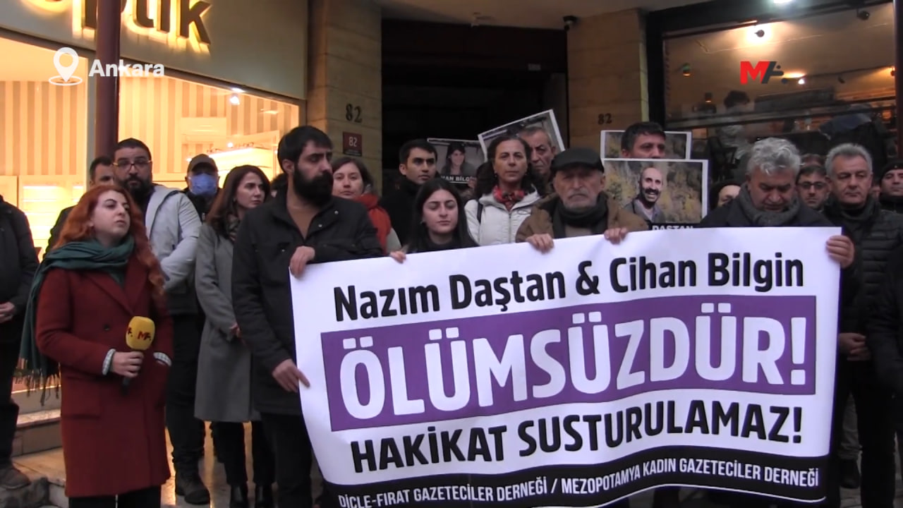Dicle Fırat Gazeteciler Derneği (DFG) ve Mezopotamya Kadın Gazeteciler Derneği’nin (MKG) çağrısıyla gazeteciler, Rojava’da TSK’nin SİHA saldırısıyla katledilen meslektaşları Nazım Daştan ve Cihan Bilgin için sokaktaydı. Mezopotamya Ajansı (MA) Ankara Bürosu önünde yapılan eyleme gazetecilerin yanı sıra DEM Parti Milletvekilleri Burcugül Çubuk, Vezir Coşkun Parlak, Sümeyye Boz, DEM Parti Ankara İl Örgütü ve Özgürlük İçin Hukukçular Derneği (ÖHD) temsilcileri de katıldı.