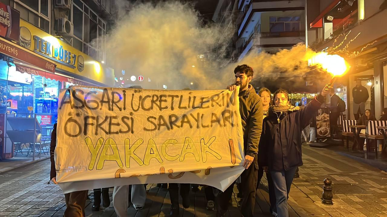 Öğrenci Faaliyeti üyeleri “Asgari ücretle Saraylılar geçinsin” sloganıyla yaptıkları yürüyüşte meşale yakarak tencere tava çaldı.
