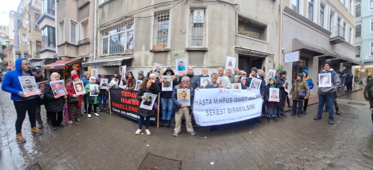 İnsan Hakları Derneği (İHD) İstanbul Şubesi Hapishane Komisyonu 667. F Oturması’nı şube binasının önünde yaptı. Açıklamada başta Silivri/Marmara 5 No’lu Hapishanesinde tutulan ağır hasta tutsak İsmet Aslan olmak üzere tüm tutsakların sağlık ve yaşam haklarının korunması için yetkilileri göreve, kamuoyunu duyarlılığa çağırdı.