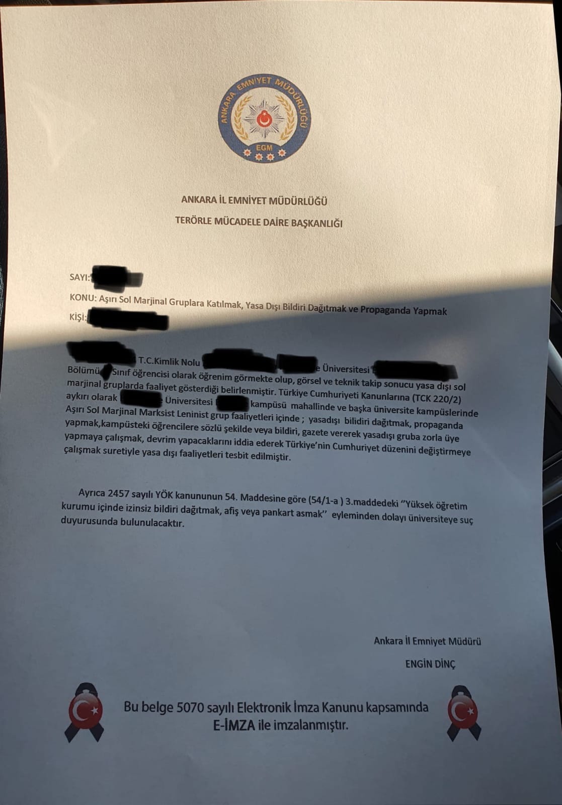 Polis tarafından verilen yazıda üniversitelinin, “aşırı sol marjinal Marksist Leninist grup faaliyetlerine” katıldığı iddia edildi. Faaliyet olarak sunulan ise bildiri dağıtmak, gazete vermek, afiş ve pankart asmak. Ankara polisi, ifade özgürlüğü kapsamında yer alan bu faaliyetleri yasadışıymış gibi göstermeye çalıştı. Ayrıca üniversitesine de suç duyurusunda bulunduğunu ekledi.