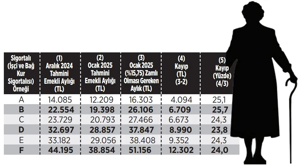 Emekliği bekleyenler ve aylık hesabı yapanlar bu ucubeye büyük tepki gösterdi. Bana gelen örneklerden bir kaçını derleyip bir tablo yaptım. Örneğin Aralık ayında SGK ekranında 22 bin 554 tahmini aylığı gören sigortalı Ocak 2025’te aynı ekranda 19 bin 398 TL tahmini aylık gördü. Oysa bu aylığın 6 aylık enflasyon oranında artmasıyla en az 26 bin 106 TL olması gerekiyordu. Kayıp en az 6 bin 709 TL ve yaklaşık yüzde 26. Kayıplar 4 bin liradan 12 bin liraya kadar ulaşıyor. Kuşkusuz bu durum geçmişte emekli olup halen emekli aylığı alanlar için geçerli değil. Halen emekli olanların almakta oldukları emekli aylığı Ocak 2025’te işçi ve Bağ-Kur emeklileri için yüzde 15,75, memur emeklileri için yüzde 11,5 oranında arttı. Bu kayıp 2024 yılında emekli olamayıp 2025 ve sonrasında emekli olacaklar için ortaya çıkıyor.