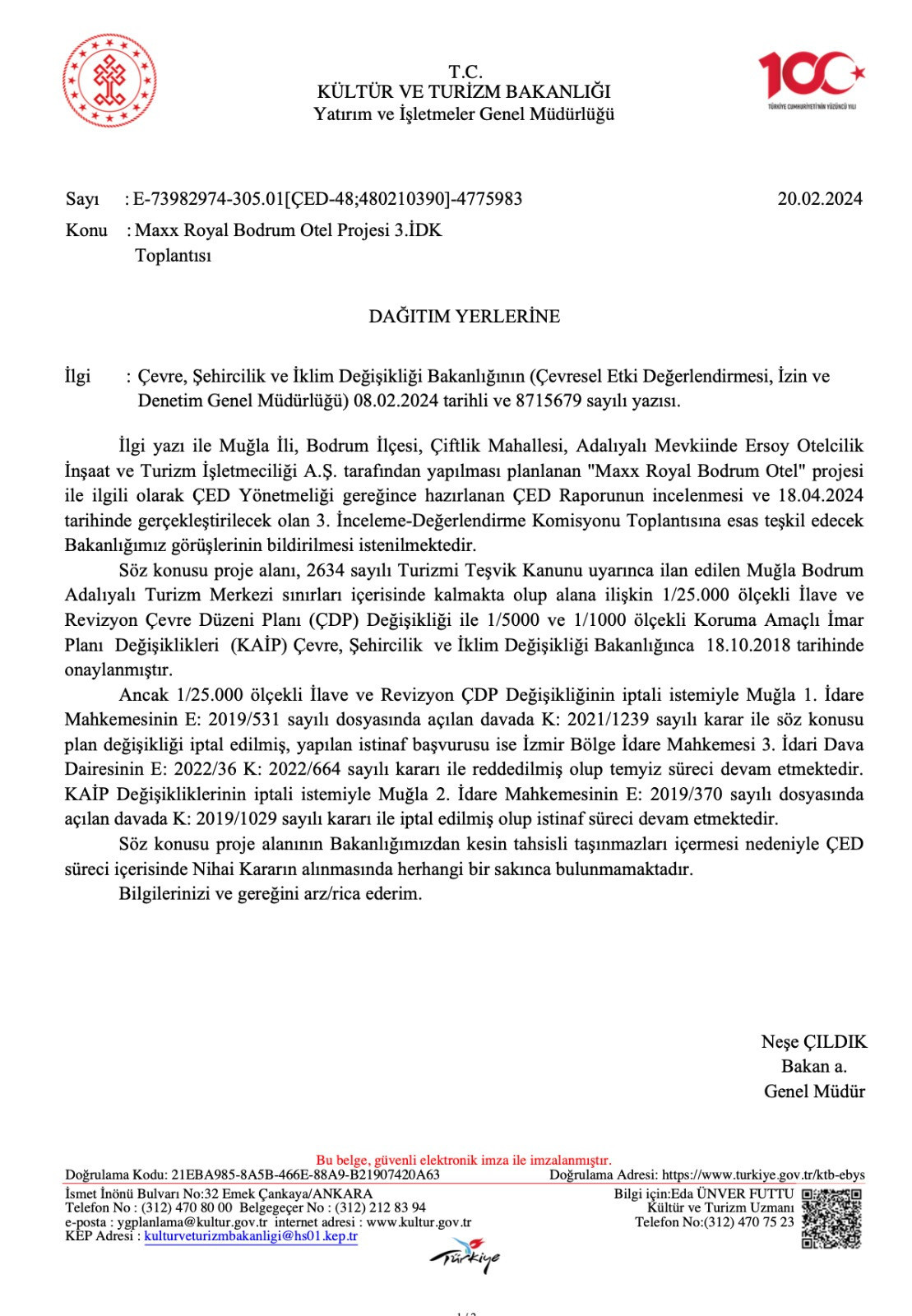 Yani Ersoy, Bakanlık yetkisini kullanmadığını ileri sürüyor. Ancak ÇED başvuru dosyasına bakıldığında Kültür ve Turizm Bakanlığı adına verilen izinlerin altındaki imza eski çalışanı Neşe Çıldık’a ait. Üstelik de imzayı, Ersoy adına atmış.