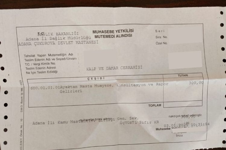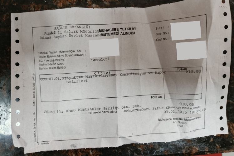 Adana’da bir esnaf, Aralık 2024’te 6 lira vererek muayene olurken Ocak 2025’e verilen randevusu için Çukurova Devlet Hastanesi’ne gittiğinde 300 lira muayene ücreti ödedi. Üstelik tek fark muayene ücreti de değil. Kan tahlili, MR gibi çeşitli test ve tetkikler için de ücret alınmazken, esnaf son gittiğinde nörolojiden istenen görüntüleme işlemleri için 910 lira para istendiğini ifade etti.