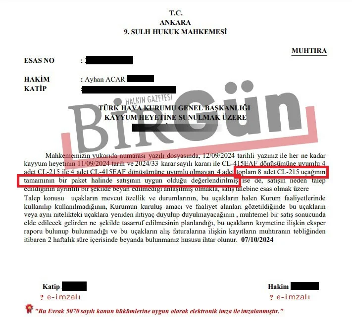Mahkeme ise 7 Ekim 2024’te “Satışın neden talep edildiğinin ve satıştan elde edilecek paranın ne yapılacağının ayrıntılı bir şekilde beyan edilmediğini” belirtilerek Kayyum Heyeti’nden açıklama istedi. BirGün’ün edindiği bilgilere göre ise söndürme uçaklarının satışı için uzun süre önce karar verildi. Gelecek günlerde de satışın yapılabileceği ifade ediliyor.