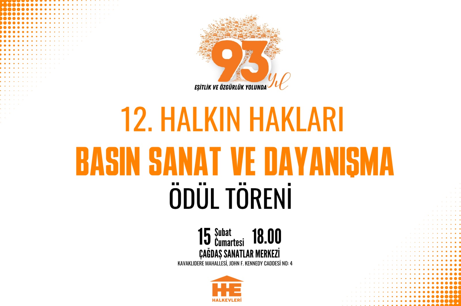 Halkevleri 93. Kuruluş Yıldönümü etkinlikleri kapsamında verilecek olan 12. Halkın Hakları Basın, Sanat ve Dayanışma Ödülleri 15 Şubat Cumartesi sahiplerini bulacak. Ödül töreni saat 18.00’de Ankara Çağdaş Sanatlar Merkezi’nde düzenlenecek.