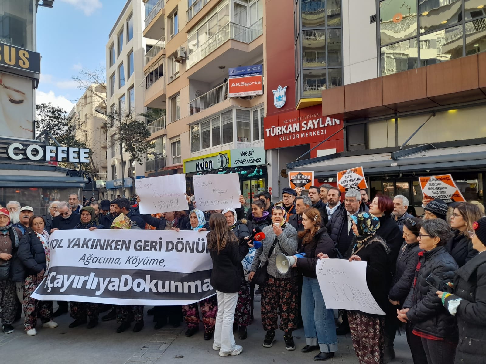 Çayırlı köylüleri, zeytin ve incir tarlalarından geçirilmek istenen yol projesine karşı İzmir Alsancak Türkan Saylan Kültür Merkezi önünde basın açıklaması yaptı. Köylüler, yol projesinin köyün altından geçirilmesine dönük taleplerini tekrarladı