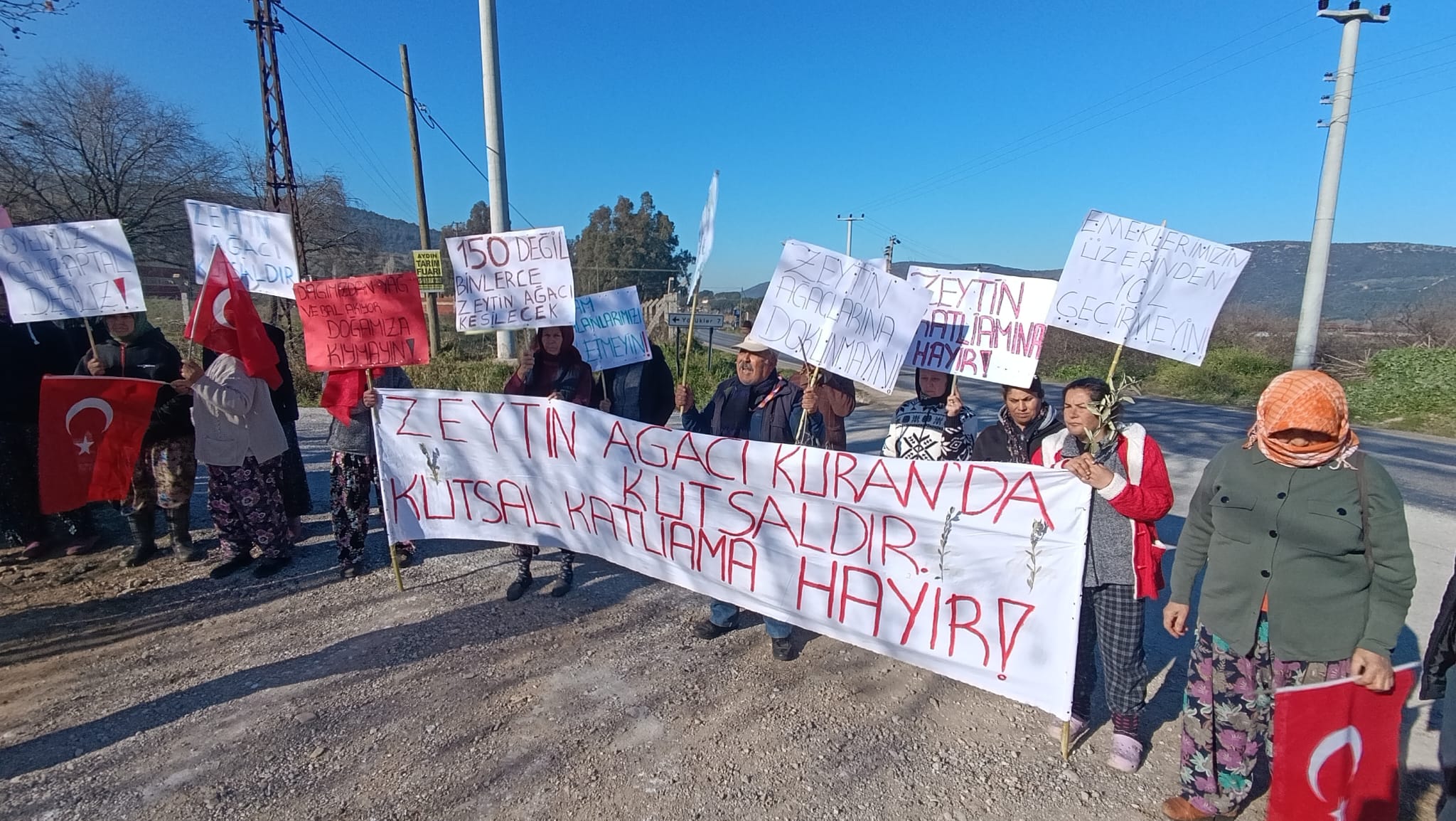Çayırlı köylüleri, kamulaştırma bedellerinin pazarlığı için gelen Karayolları Genel Müdürlüğü’nün görüşmeleri yapacağı şantiye alanının önüne giderek nöbete başladı. Köylüler, projenin zeytin ve incir ağaçlarının yok olmasına neden olacağını, ağaçlarından vazgeçmek istemediklerini söyledi