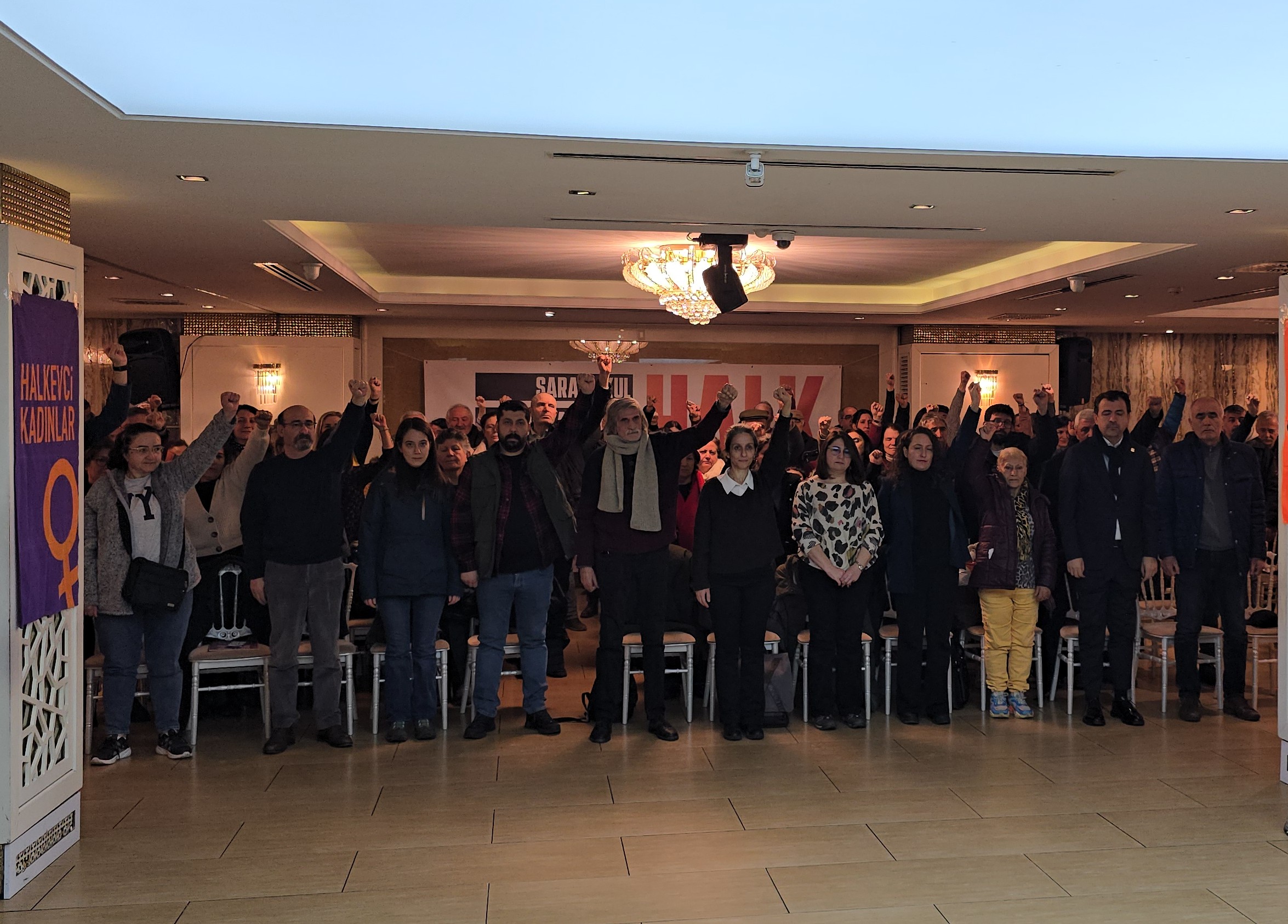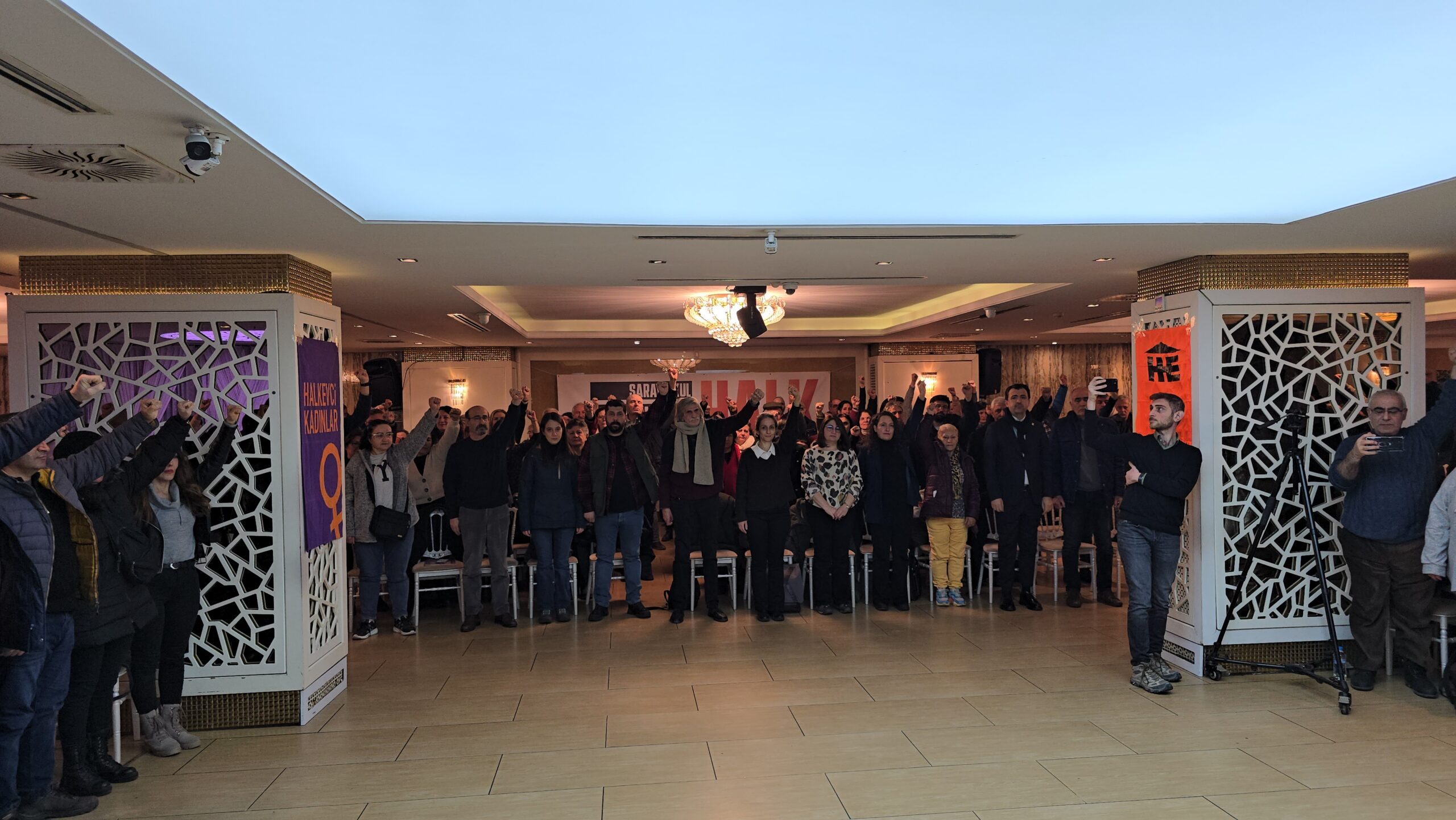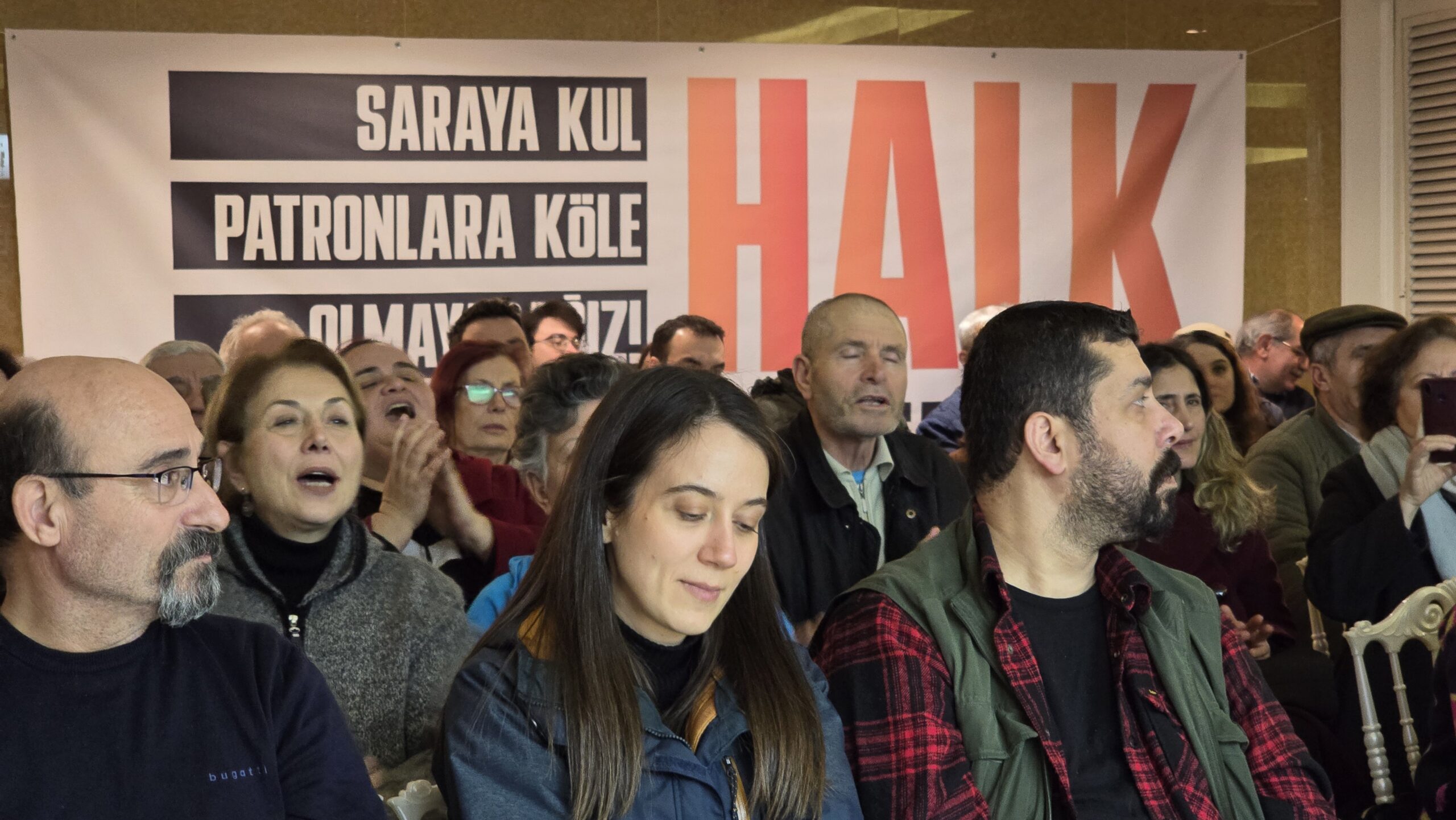 HDK’ye yönelik operasyon ve tutuklamaların hatırlatıldığı salonda “Yaşasın devrimci dayanışma” sloganı atıldı.