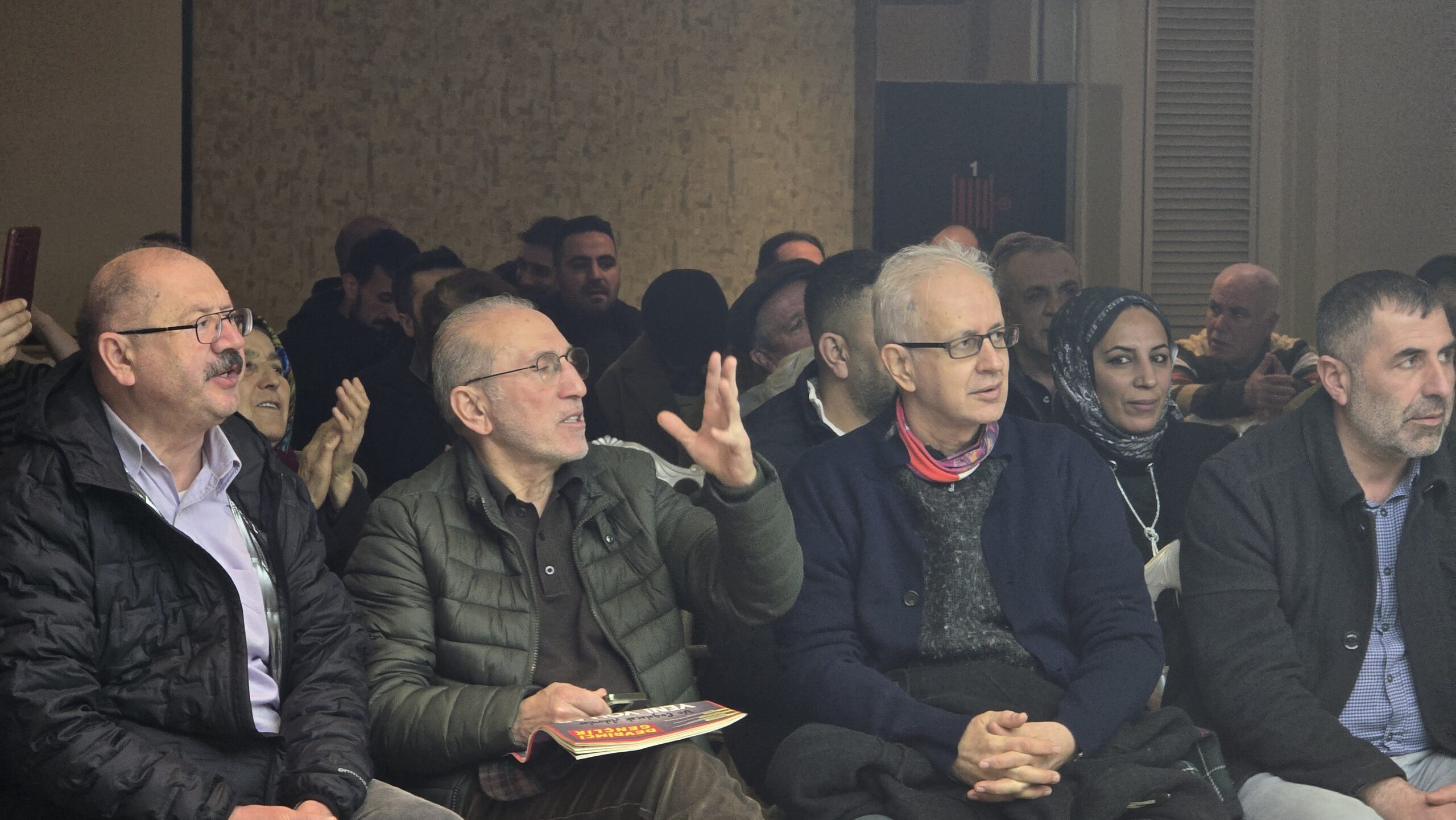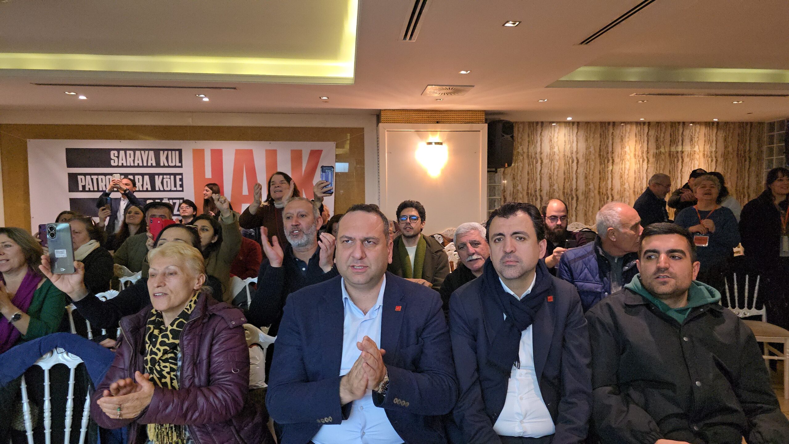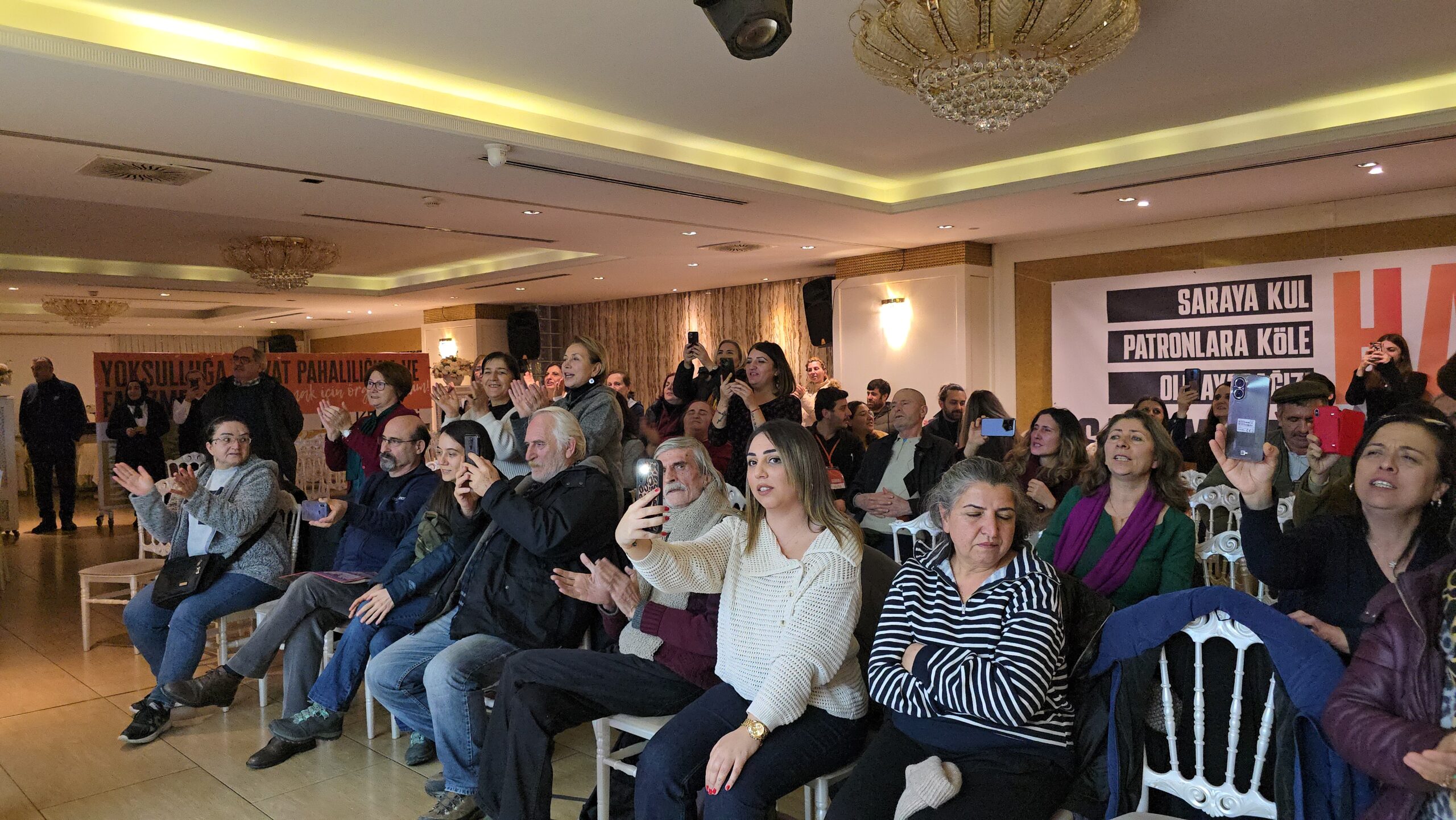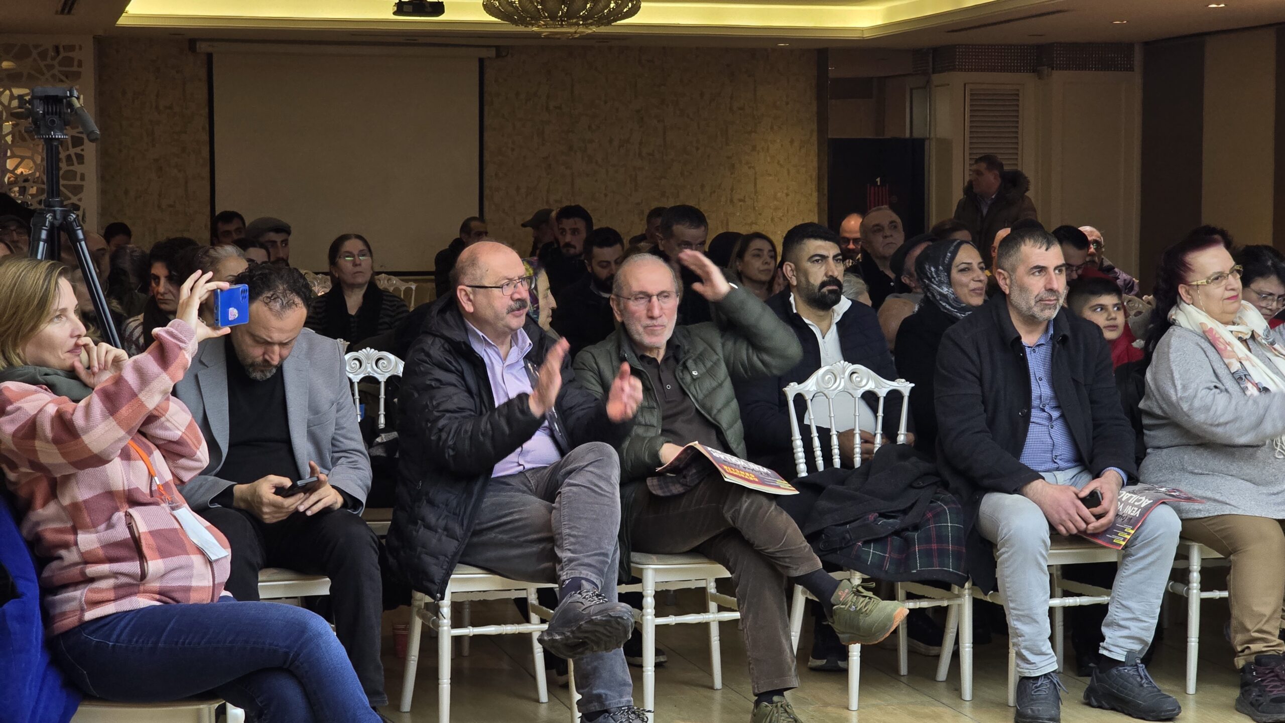HDK’ye yönelik operasyon ve tutuklamaların hatırlatıldığı salonda “Yaşasın devrimci dayanışma” sloganı atıldı.