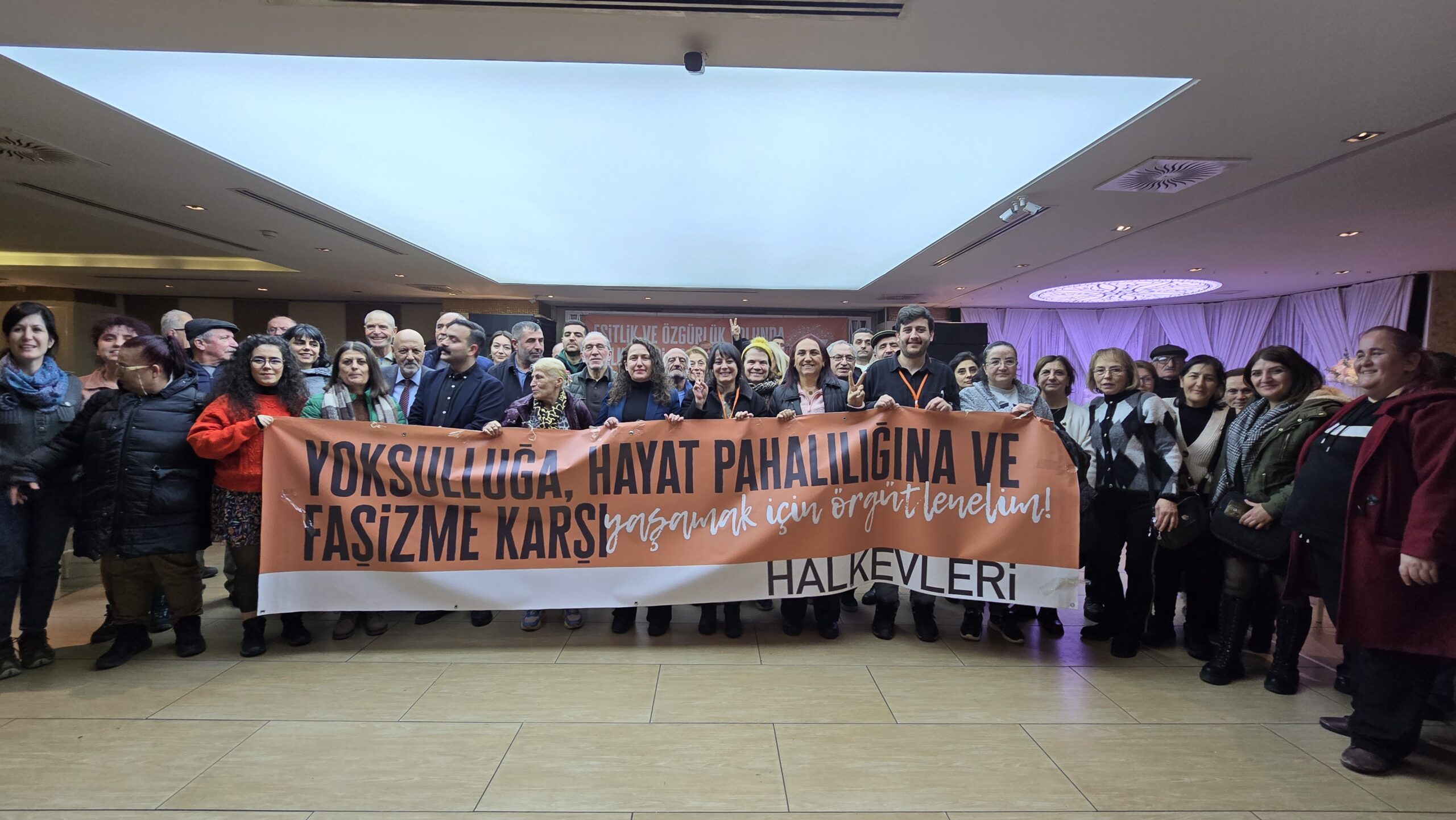 Halkevciler etkinlik sona ererken salonda etkinlik boyunca asılı duran “Yoksulluğa, hayat pahalılığına ve faşizme karşı yaşamak için örgütlenelim” yazılı pankart ile hatıra fotoğrafı çektirirken “Yaşasın halkın hakları mücadelemiz” sloganını attı.