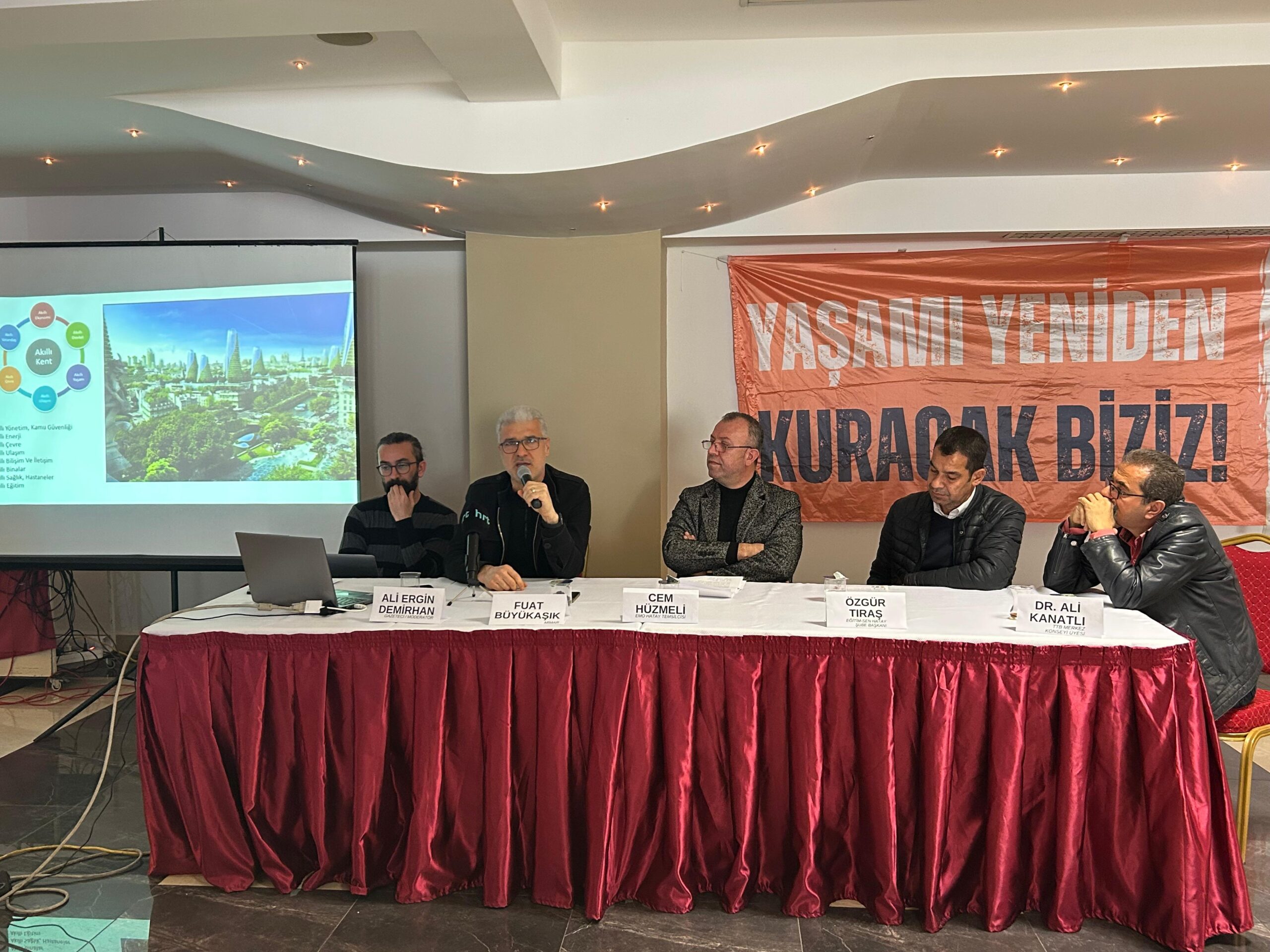 “Sağlık” başlığı altında bir sunum yapan TTB Merkez Konsey üyesi Dr. Ali Kanatlı da sağlıktaki neoliberal dönüşümün yarattığı yıkımın sonuçları depremde yakıcı biçimde görüldüğünü ifade etti. Sağlığın kamusal bir hizmet olmaktan çıkarılması ve piyasalaştırılmasının artan oranda bebek ölümlerine, nitelikli tedaviye erişimde engellere yol açtığını vurguladı. Kanatlı sağlık emekçilerinin yetersiz koşullar nedeniyle kenti terk ettiğini ve kalanların da ağır iş yükü aldında tükeniş yaşadığını belirtti.