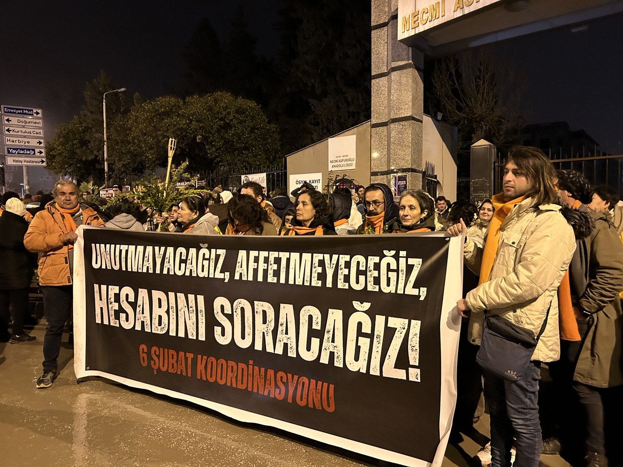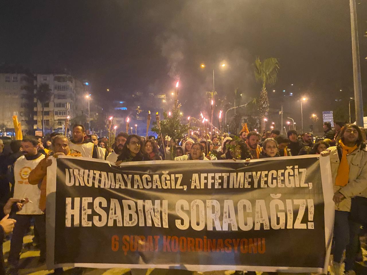 6 Şubat depremlerinin ikinci yıldönümü Hatay’da 6 Şubat Koordinasyonu’nun çağrısıyla depremin meydana geldiği saat 04.17’de yapılan eylemle karşılandı. Necmi Asfuroğlu Anadolu Lisesi önünden Uğur Mumcu Meydanı’na yapılan meşaleli yürüyüşte Hatay halkı defne dalları da taşıdı. Meşaleli yürüyüşte sık sık “Me rıhna nıhna hon” (Gitmedik, buradayız), “Unutmak yok, affetmek yok, helalleşmek yok” sloganları atıldı.