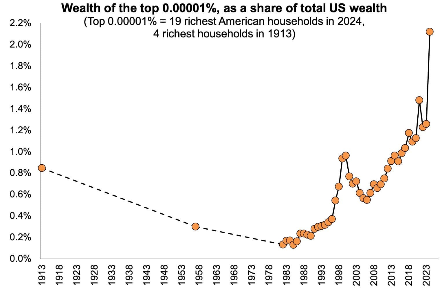 ABD’de toplumun en varlıklı yüzde yüz binde birinin varlıklarındaki değişim. Oligarşinin yükselişinin resmi. Varlıklıların 1913’lerde yüzde 80’lerde olan vergilendirilmeleri Reagan döneminde tersine çevrilerek neredeyse yok seviyesine indiriliyor. Tekelleşme, emperyalizm, aşırı sömürü, sistemdeki talan, çökme, el koyma, şantaj, rüşvet gibi araçlarla ivme kazanan varlık edinme 2023’lerde asimptotik bir fırlayışla bugünkü hale geliyor. Amazon’un Jeff Bezos’u, Tesla’nın Elon Musk’ı, Facebook’un Mark Zuckerberg’i ve bir avuç banker ve silah üreticisi bu oligarşinin en tanınan temsilcileri. Bunların hepsi ve bir avuç multimilyarder daha Trump seçilince kapısını aşındırmaya başlayıp, ondan devlet desteği almaya sıraya girdiler. Bugün ise hükümeti Trump’ın mı yoksa tek bir oy bile almamış, seçilmemiş, sadece Trump’la kişisel bağı olduğu için devleti yönetmeye getirilmiş Musk’ın mı yönettiği açıkça tartışılıyor.