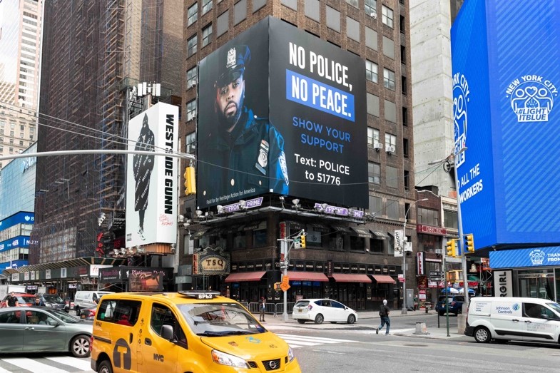 Tutucu düşünce örgütünün New York Times Meydanı’nda “Polis yoksa huzur da yoktur” reklamı. Siyahileri öldüren polislere karşı yükselen ‘Siyah Hayatlar da Önemlidir’ kampanyasına bir yanıt. Reklamda siyahi hareketi bölmek için siyahi bir polis kullanılması dikkat çekiyor.
