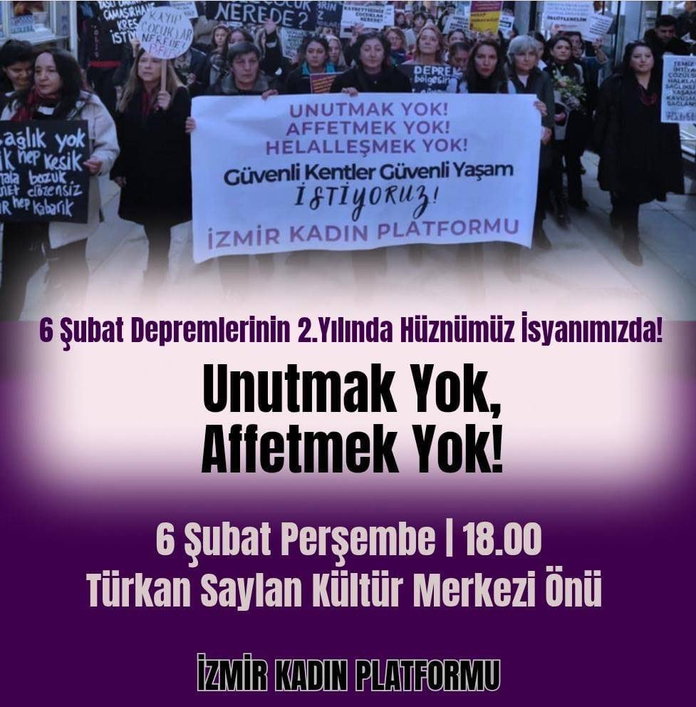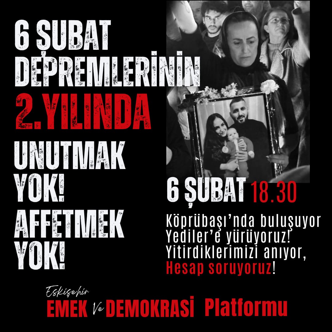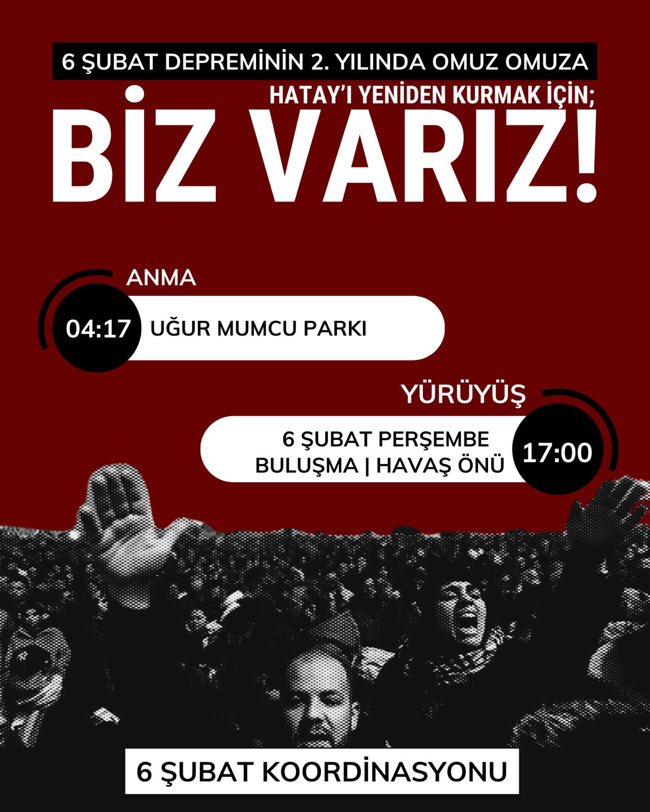 6 Şubat 2023’te meydana gelen depremlerin ikinci yıldönümü dolayısıyla deprem bölgesinde ve Türkiye’nin dört bir yanında anma eylemlerine çağrılar yapıldı. Eylemler 5 Şubat günü akşam saatlerinden 6 Şubat günü akşam saatlerine kadar birçok yerde düzenlenecek. Deprem bölgesinde hayatını kaybedenlerin aileleri tarafından depremin meydana geldiği saat 4.17’de apartmanlar önünde anmalar yapılacak