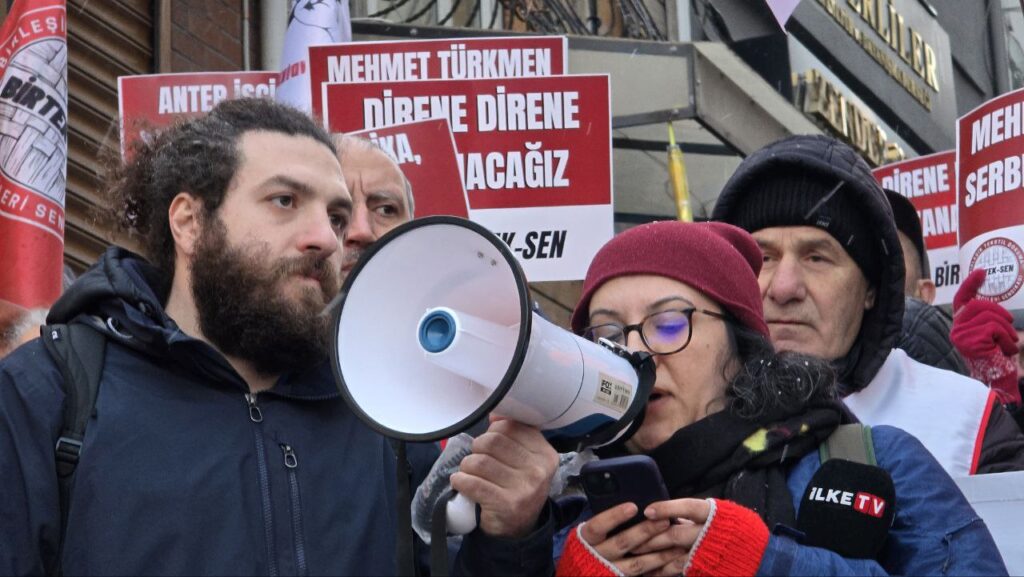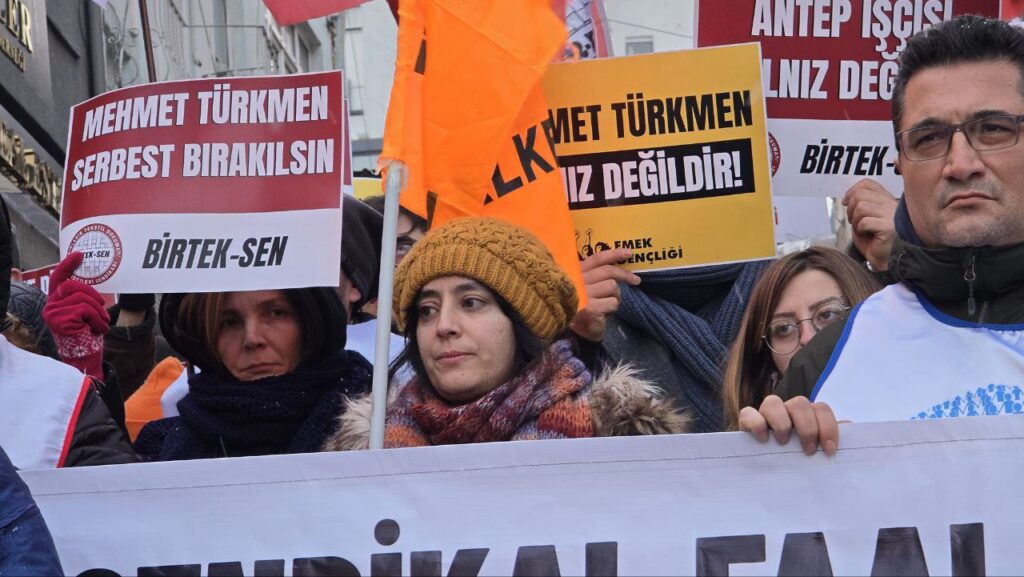 Birleşik Tekstil Dokuma ve Deri İşçileri Sendikası’nın (BİRTEK-SEN) çağrısıyla bugün (20 Şubat) saat 18.30’da Beyoğlu Tophane’de bulunan Çalışma ve İş Kurumu İl Müdürlüğü önünde “Sendikal faaliyet engellenemez, Mehmet Türkmen serbest bırakılsın” diyerek bir araya gelenler eylemde.