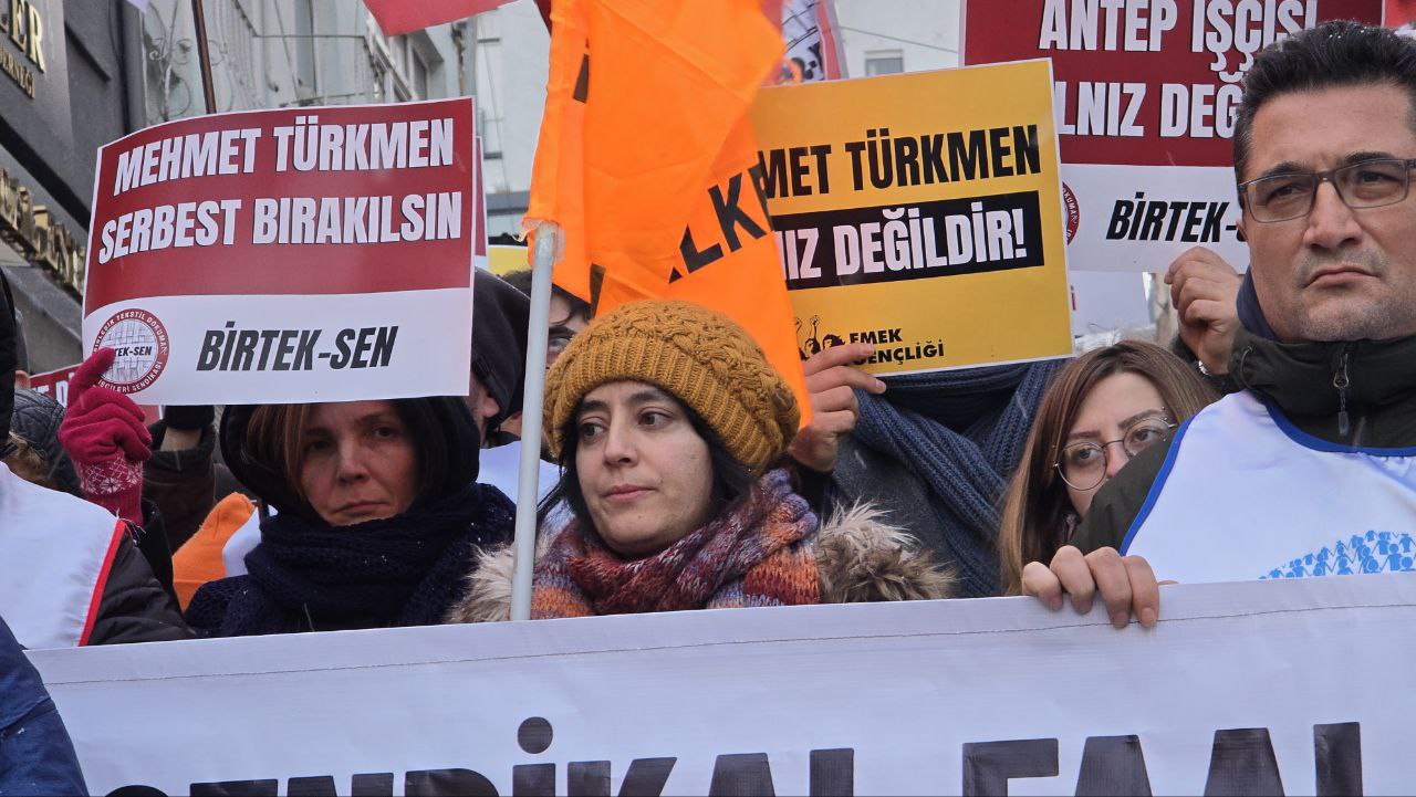 Eylemde BİRTEK-SEN Genel Başkanı Mehmet Türkmen’in Antep’te devam eden direniş sırasında gözaltına alınıp serbest bırakılması ve sonra tekrar gözaltına alınıp tutuklanmasına tepki gösterildi.