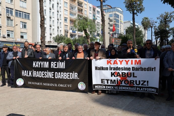 Mersin’de Emek ve Demokrasi Platformu öncülüğünde irade gaspına karşı, Özgür Çocuk Parkı’nda yapılan açıklamada, “Kayyum rejimi halk iradesine darbedir”, “Kayyum halk iradesine darbedir, kabul etmiyoruz” pankartları açıldı. Açıklamada sık sık, “Kayyum darbedir, darbelere hayır” sloganı atıldı.