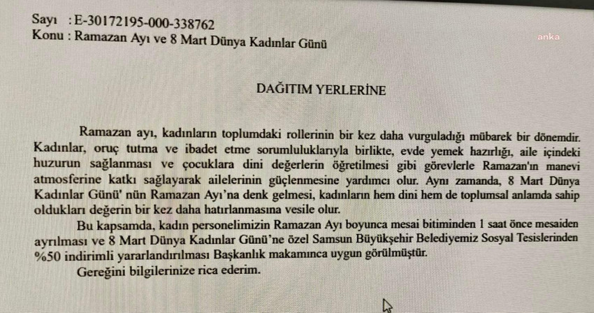 AKP’li Samsun Büyükşehir Belediyesi, kadın çalışanlarına Ramazan ayı ve 8 Mart Dünya Kadınlar Günü vesilesiyle bir mesaj gönderdi.