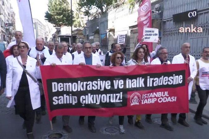 İstanbul Tabip Odası, Ekrem İmamoğlu’nun gözaltına alınmasına karşı Cağaloğlu’nda bulunan binalarından Saraçhane’ye yürüdü. Beyaz önlükleriyle yürüyen hekimler, Tıbbiye geleneğini sahiplendiklerini, geleceklerini kimseye teslim etmeyeceklerini ifade etti. Yürüyüş boyunca sık sık “Saray’ın hekimi olmayacağız” sloganı atıldı.
