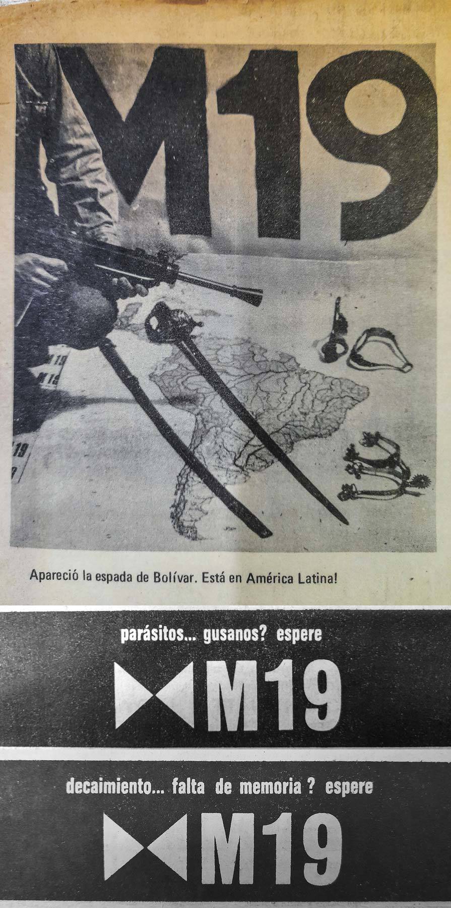 M-19, kuruluşundan itibaren ülke çapında ses getiren sansasyonal işlere imza atar. Her şeyden önce örgüt, resmen kuruluşunu ilan etmeden önce 1974 yılında gazetelere dikkat çekici ilanlar verir: “Parazitlere ve kurtçuklara karşı, M-19’u bekleyin”, “Unutkanlık ve hafıza kaybına çare, M-19’u bekleyin” ya da “Yaralarınızı M-19 iyileştirecek, bekleyin” gibi basit fakat kesinlikle göz alıcı ifadeler süreli yayınlarda boy gösterir.