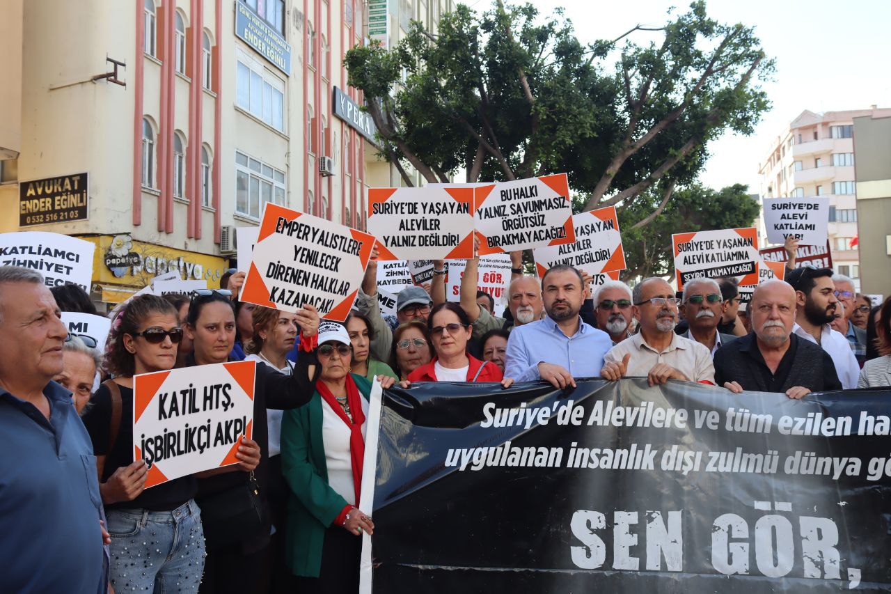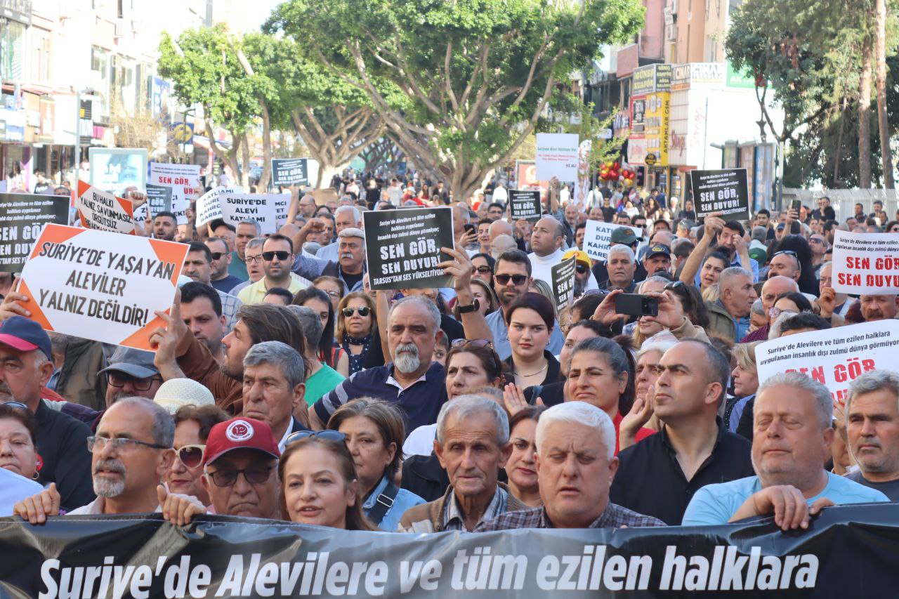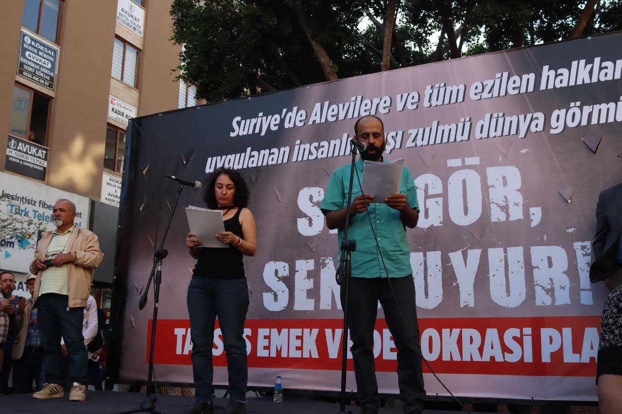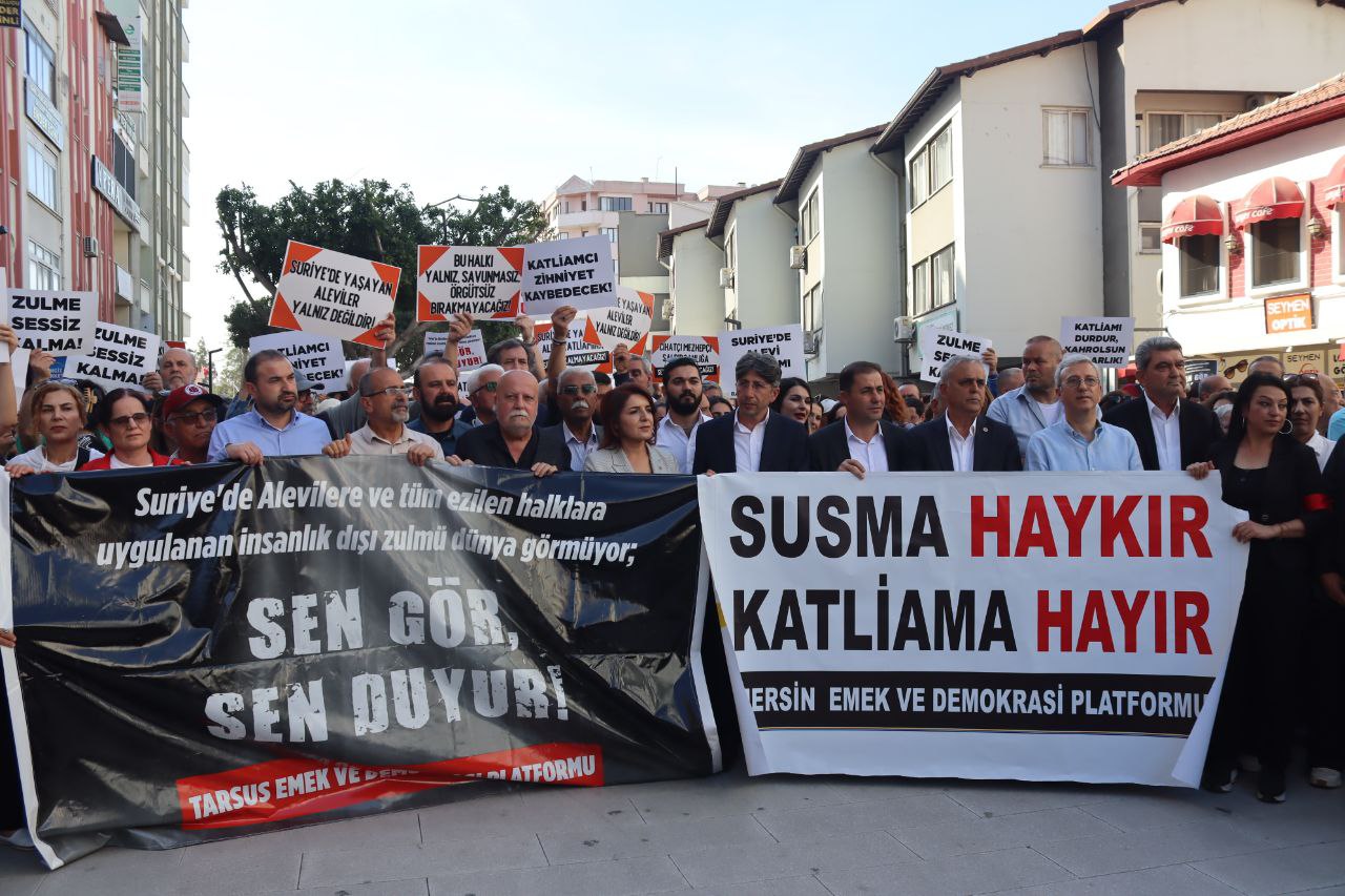 Tarsus’ta Tarsus Emek ve Demokrasi Platformu ile Mersin Emek ve Demokrasi Platformu, Suriye’deki Alevi katliamına karşı miting düzenledi. Miting için Tarsus Halk Eğitim Merkezi önünde bir araya gelen kitle buradan sloganlarla yürüyüşe geçti. Miting alanında yapılan konuşmalardan sonra Suriye’deki Alevi halkına Arapça ve Türkçe okunan mesajla seslenildi. Basın açıklamasının okunmasından sonra sloganlarla miting sona erdi