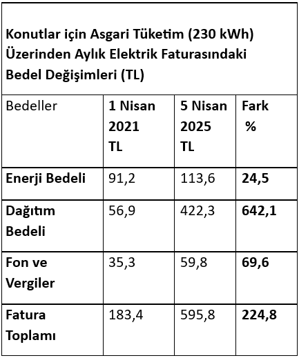 Başka bir deyişle, elektrik faturasının yüzde 70,9`unu ise dağıtım bedeli oluşturuyor. Tarife değişikliği öncesinde yüzde 65,9 düzeyinde olan dağıtım bedeli, yüzde 70’in üzerine çıktı. Oysa sadece üç yıl önce dağıtım bedeli, faturanın yüzde 22’siydi. Dağıtım bedelinde üç yıl içinde ortaya çıkan üç kata yakın artış, elektrik faturasında da büyük bir haksızlık ve adaletsizlik demek.