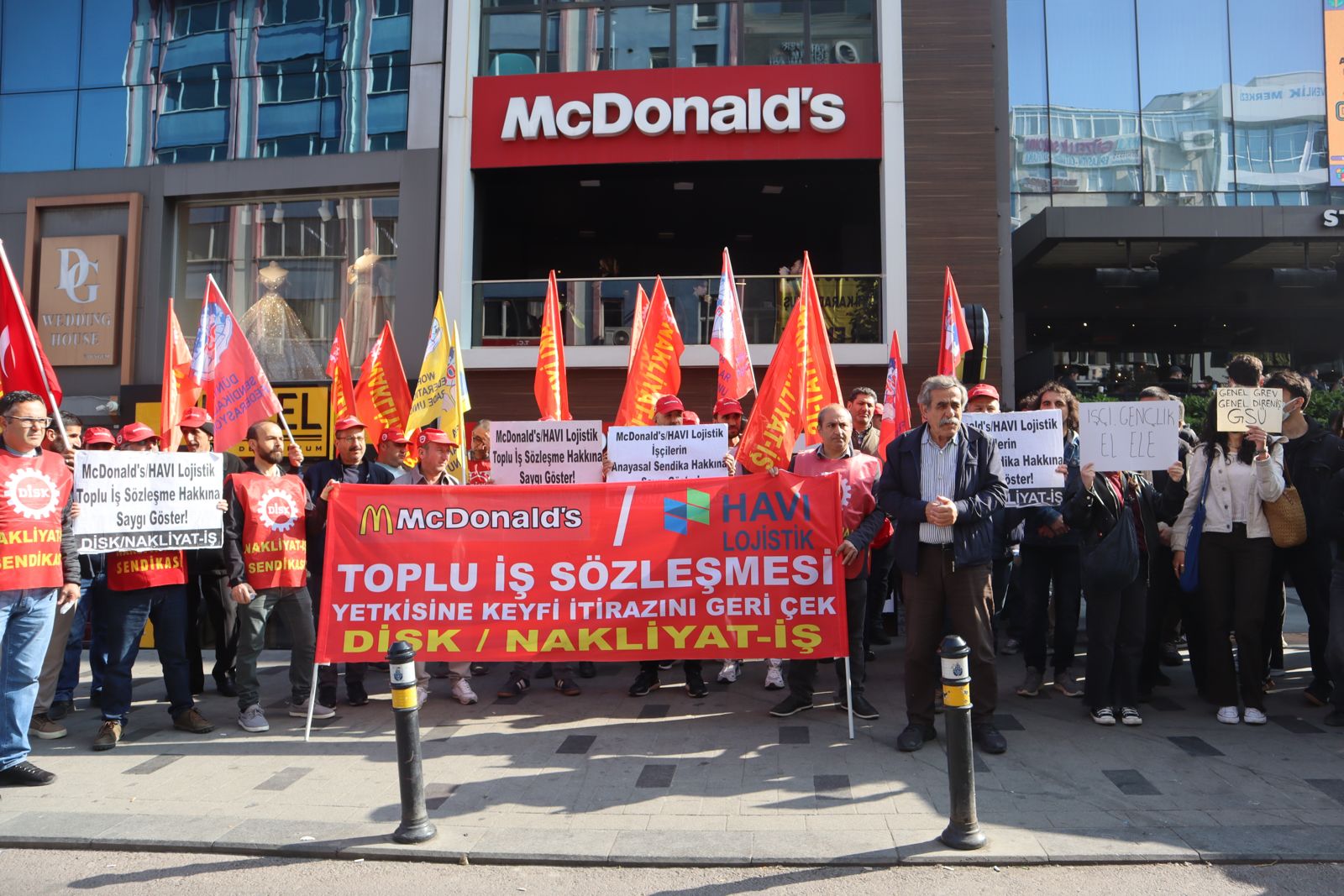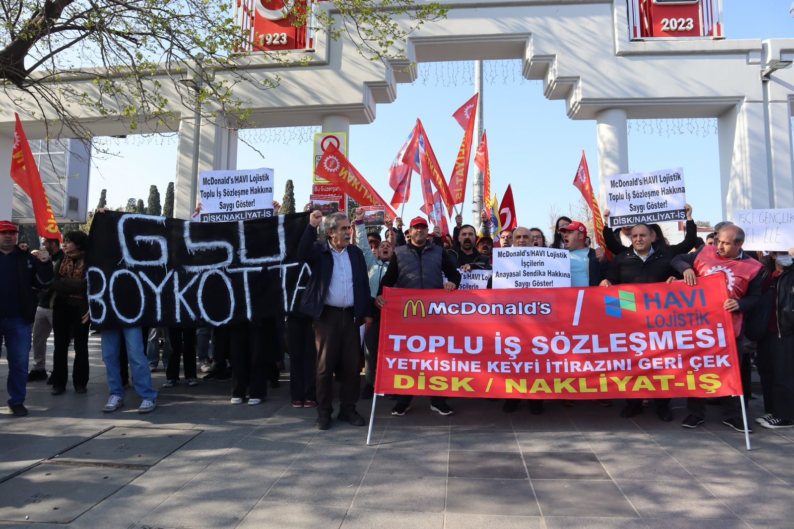 McDonald’s’ın küresel lojistik hizmet sağlayıcısı olan Alman menşeli Havi Lojistik’in Türkiye’deki işçilerin sendikal haklarını tanımamak için yürüttüğü hukuki manevralara karşı mücadele büyüyor. Nakliyat-İş’in öncülüğünde yürütülen direnişe bugün Bakırköy’de Galatasaray Üniversitesi öğrencileri de katıldı. Öğrenciler, işçilerle omuz omuza durarak “İşçi gençlik el ele, genel greve” sloganları attı ve işçi sınıfını ve sendikaları genel greve çağırdı.